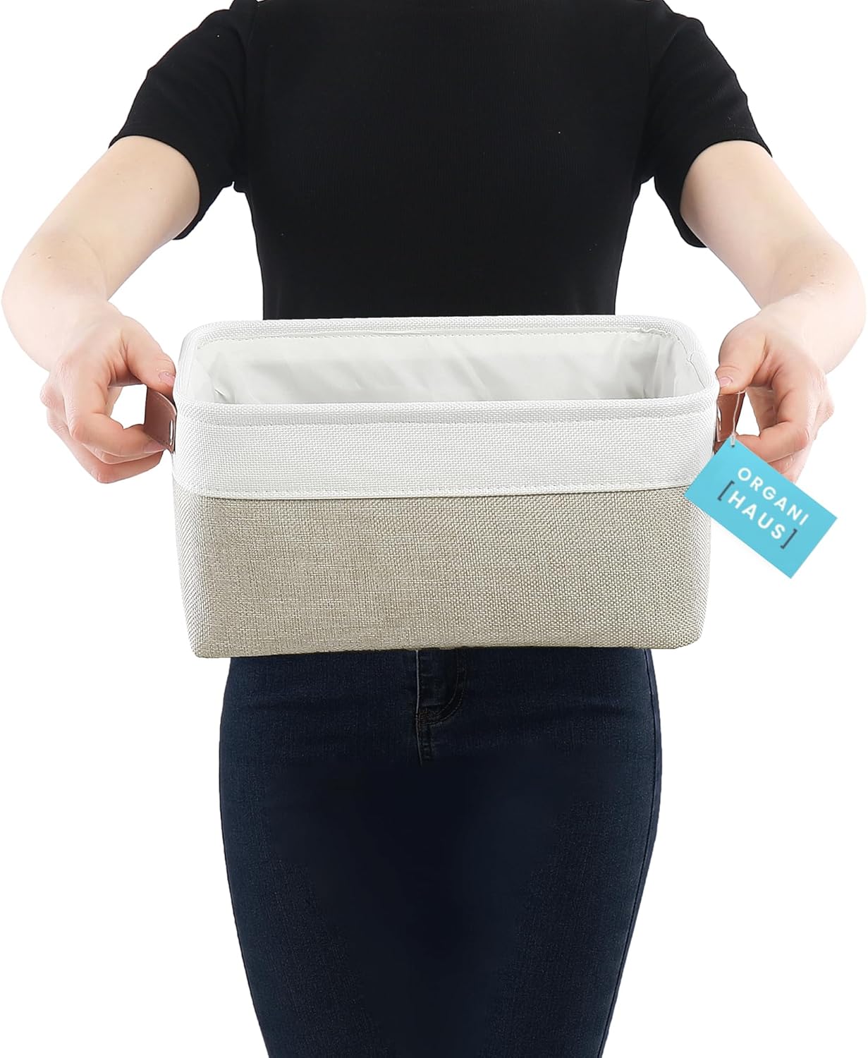 OrganiHaus Small Fabric Storage Baskets for Shelves 3 Pack, 12x8in Closet Storage Bins for Shelves, Cloth Baskets for Organizing, Linen Closet Organizers, Fabric Basket, Beige/White