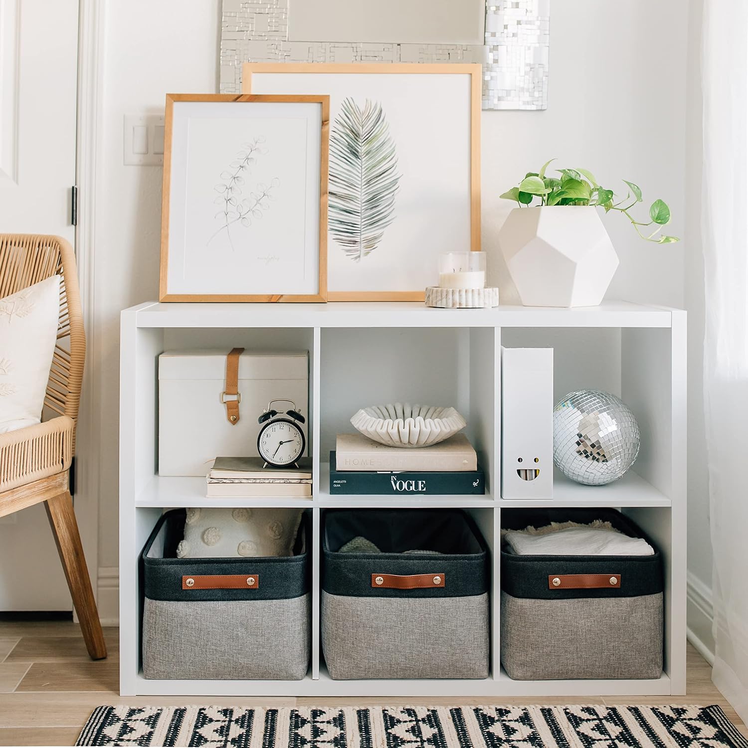 - Decorative Fabric and Vegan Leather β These versatile storage baskets for organizing your everyday life are made with a thick, high-quality fabric and fitted with leather handles to add a stylish touch to a living room, bedroom, office, or personal space.