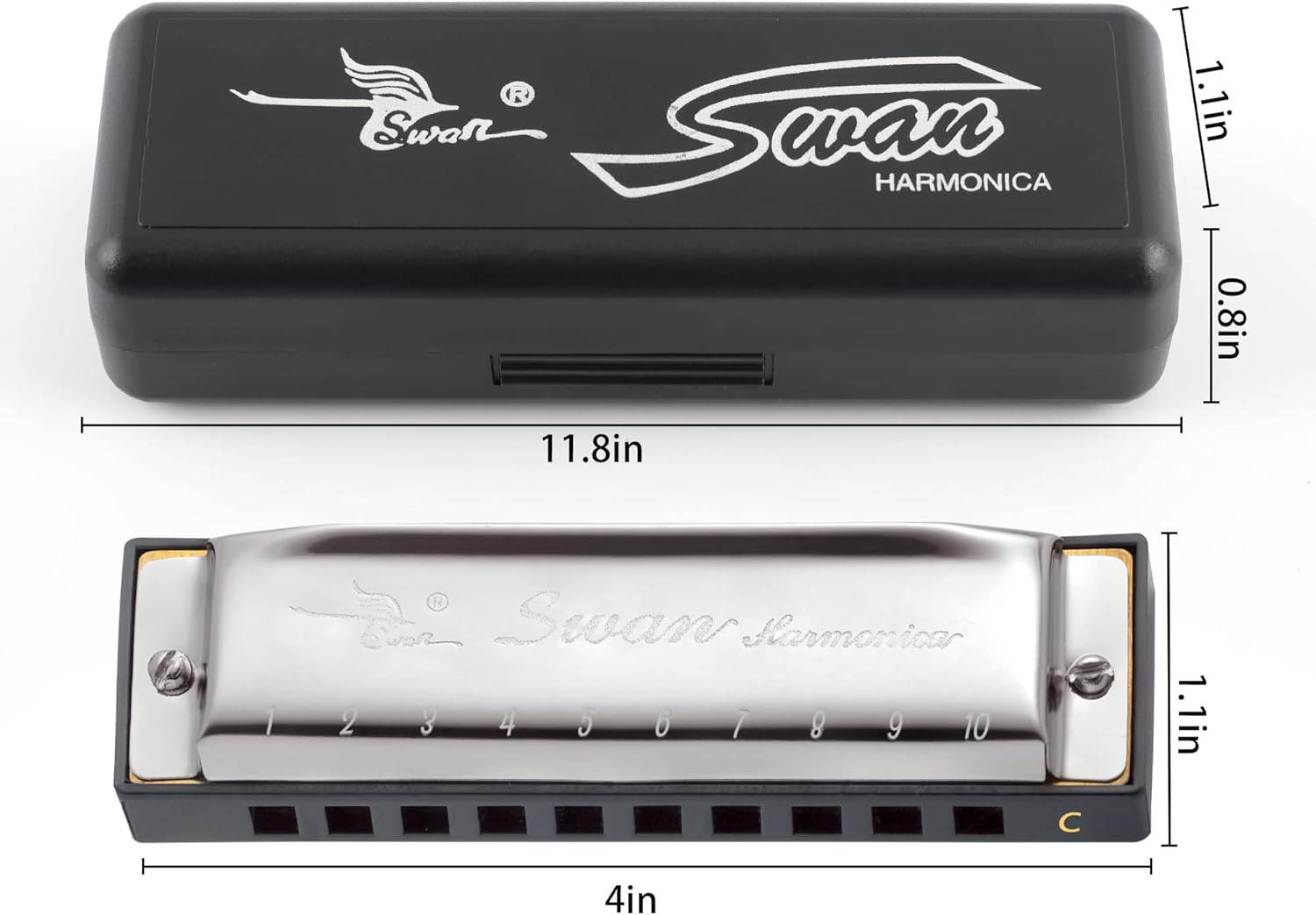 - Compact And Portable: At 4.33 Inch long, 1.57 Inch wide, and weighs only 0.22 pounds, the SWAN harmonica is extremely portable. It comes with a protective case for safe storage.