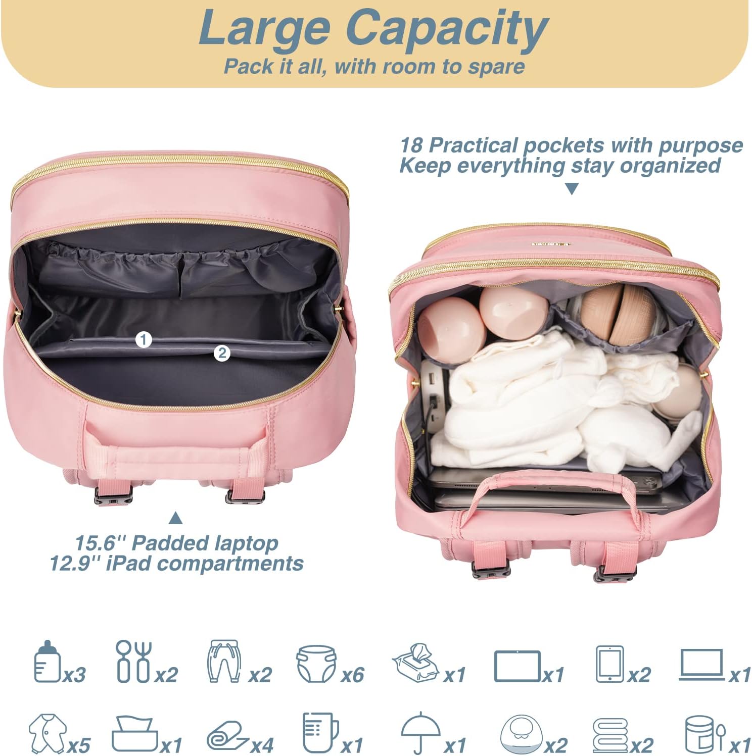 - Convenient and Thoughtful: Baby diaper bag features 15.6ββ padded laptop pocket and 12.9ββ iPad pocket in the main compartment, USB charging port, 2 built-in stroller straps, waterproof pocket, back anti theft pocket, dual zippers for easy access and closure even with one hand! Also we have added a luggage sleeve on the back so it can easily slide over a carryon luggage while on the go.