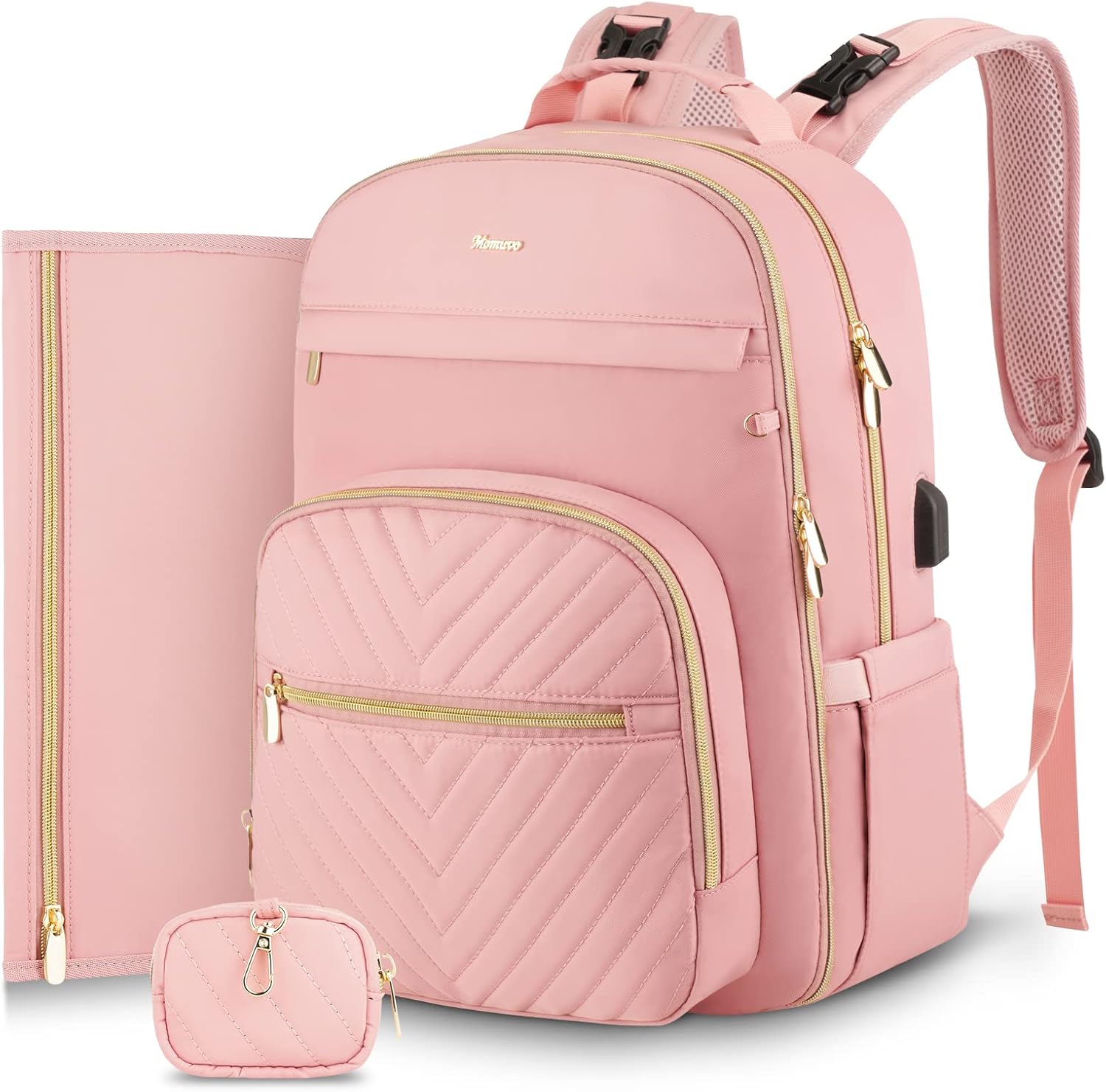 MOMUVO Diaper Bag Backpack, Quilted Baby Bag with Changing Pad & Stroller Straps & Pacifier Case, Large Travel Diaper Bags for Mom Dad, Pink