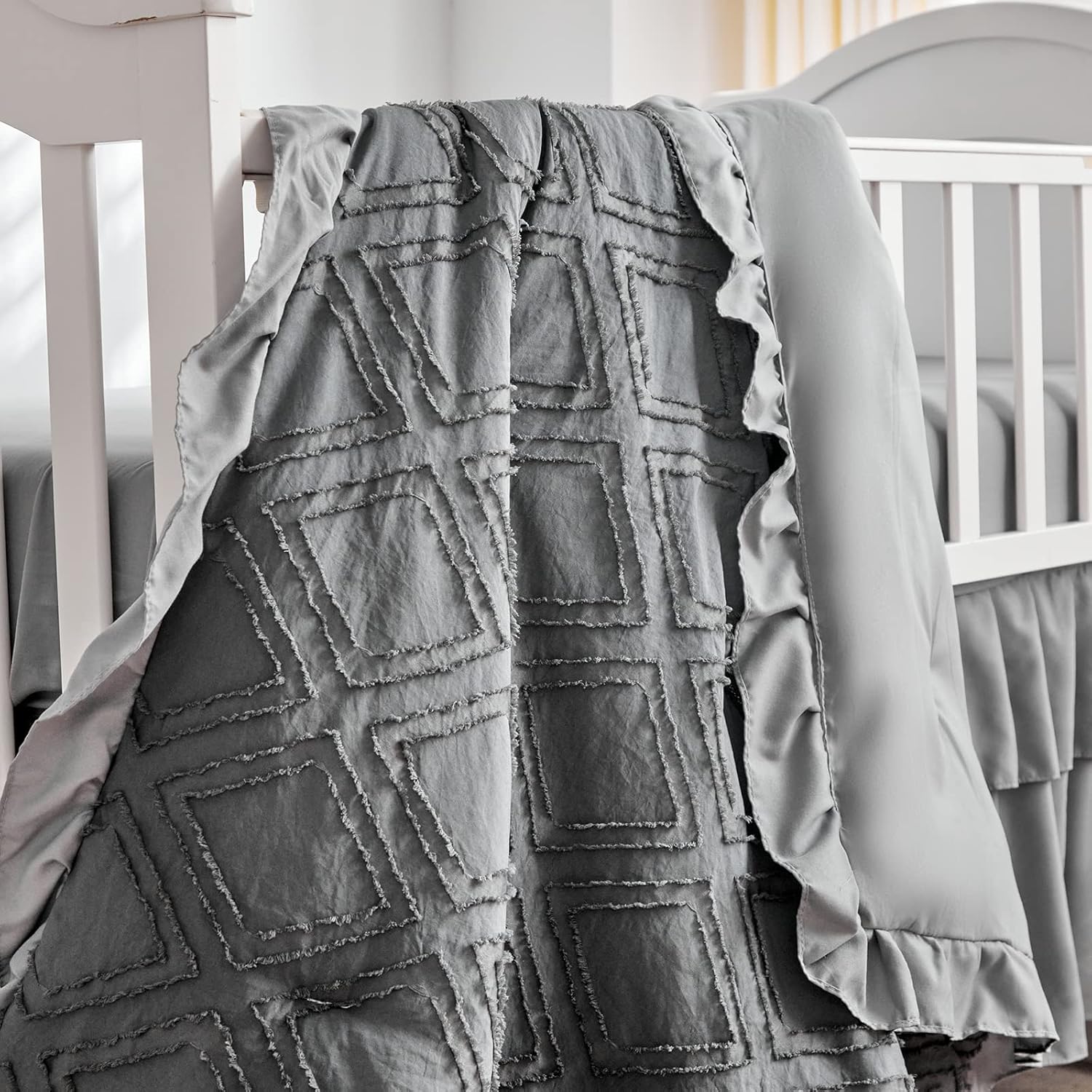 Tufted Ruffle Crib Bedding Set 3 Pieces Baby Boho Quilted Comforter with Fitted Sheet and Bed Skirt - Cute Ruffled Shabby Chic Baby Bedding Soft Blanket Design Gray