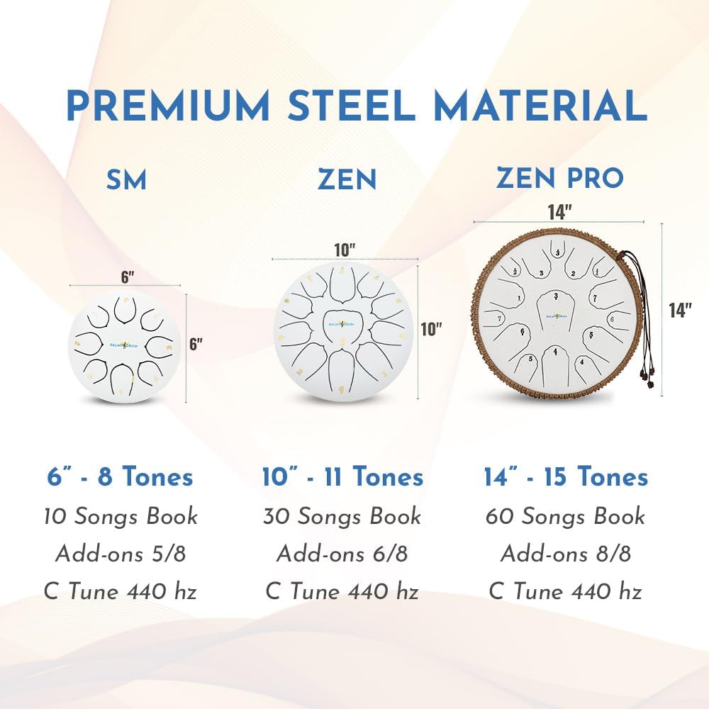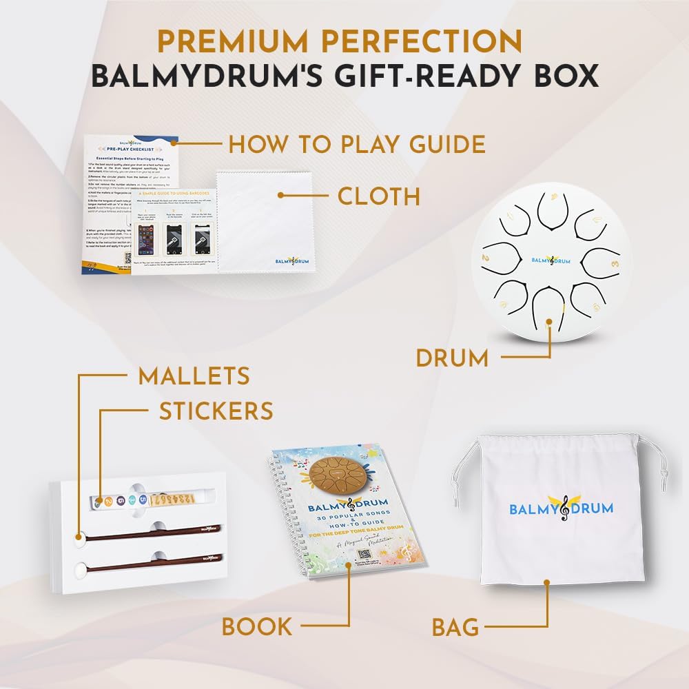 The Balmy Drum - 8 Note 6 Inch Steel Tongue Drum, Steel Drum Instrument, Drums For Children and Adults, Balmy Drum Set for Kids with Music Book, Handpan, Mallet and Carry Bag (White)
