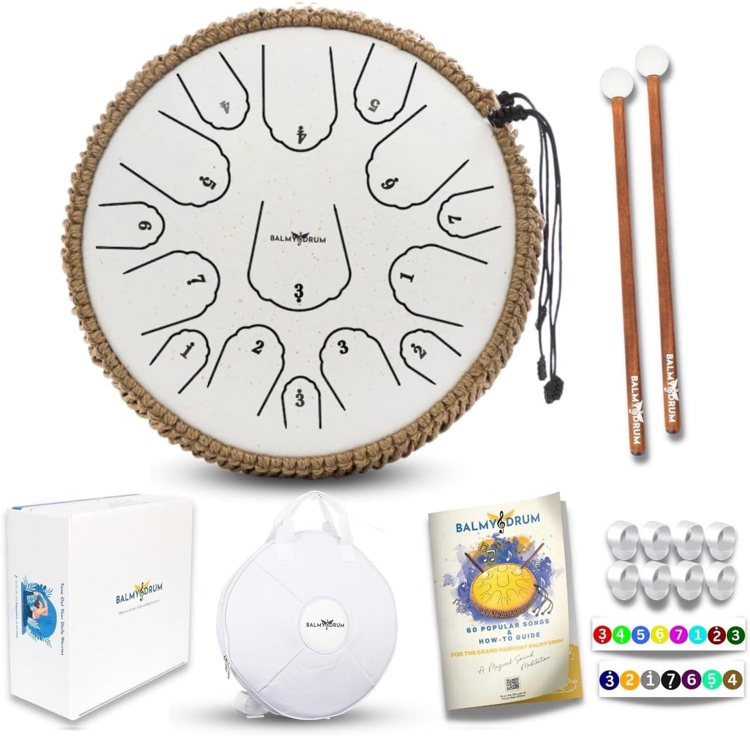 The Balmy Drum - 15 Note 14 Inch Steel Tongue Drum, Steel Drum Instrument, Drums For Children and Adults, Balmy Drum Set for Kids with Music Book, Handpan, Mallet and Carry Bag (White)