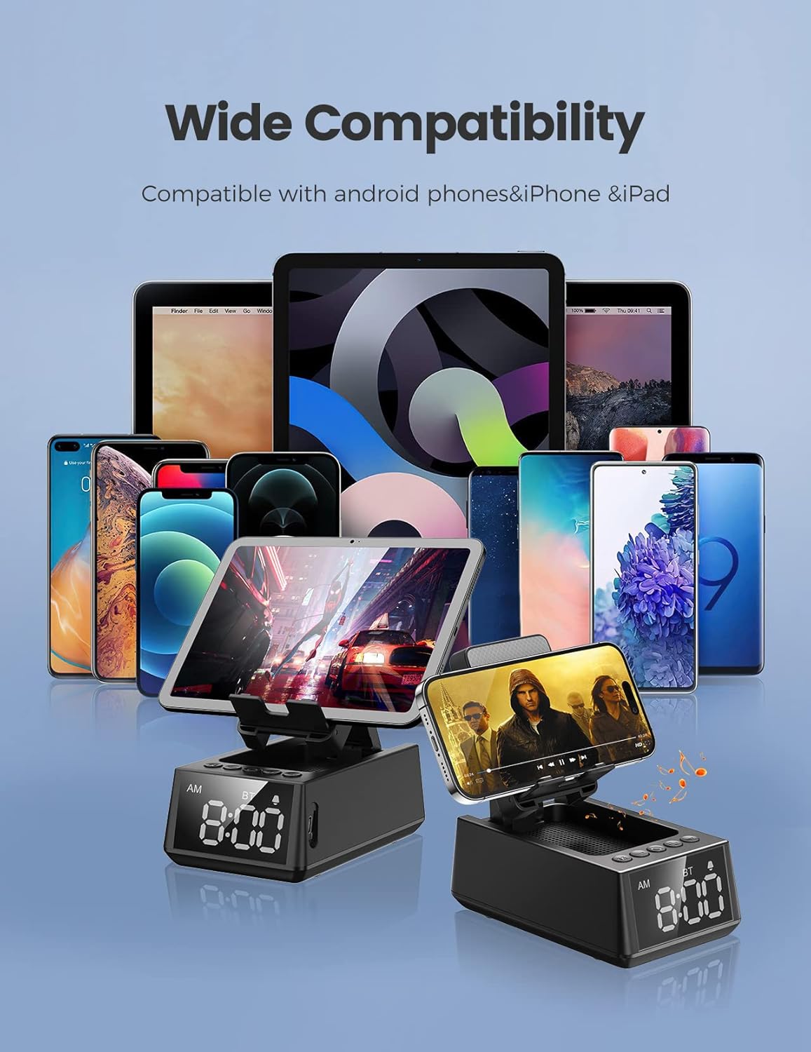 - 3-In-1 Design: A multifunctional, stylish, and cool gadget that combines a Bluetooth speaker, alarm clock, and phone stand in one. The adjustable stand is stable and meets the usage requirements for various viewing angles. It features stereo sound , with rich bass and clear treble, enhancing your audio experience when used with a phone, suitable for binge-watching, gaming, making video calls without hands to hold phone, or online meetings. This is the perfect gift for oneself and others.