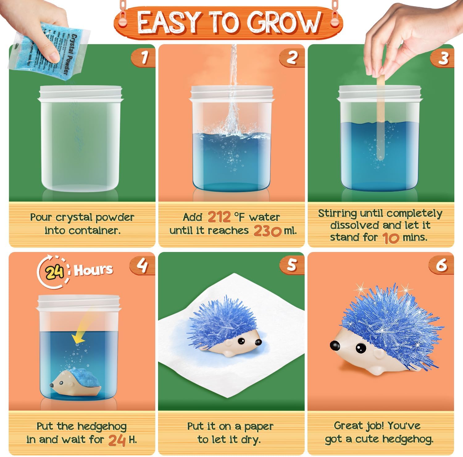 - Satisfaction Guaranteed: All of our products come with a 100% satisfaction guarantee. If there is any question with the Hedgehog Crystal Growing Kit for kids, please feel free to contact us. We will be sure to help you with our best service.