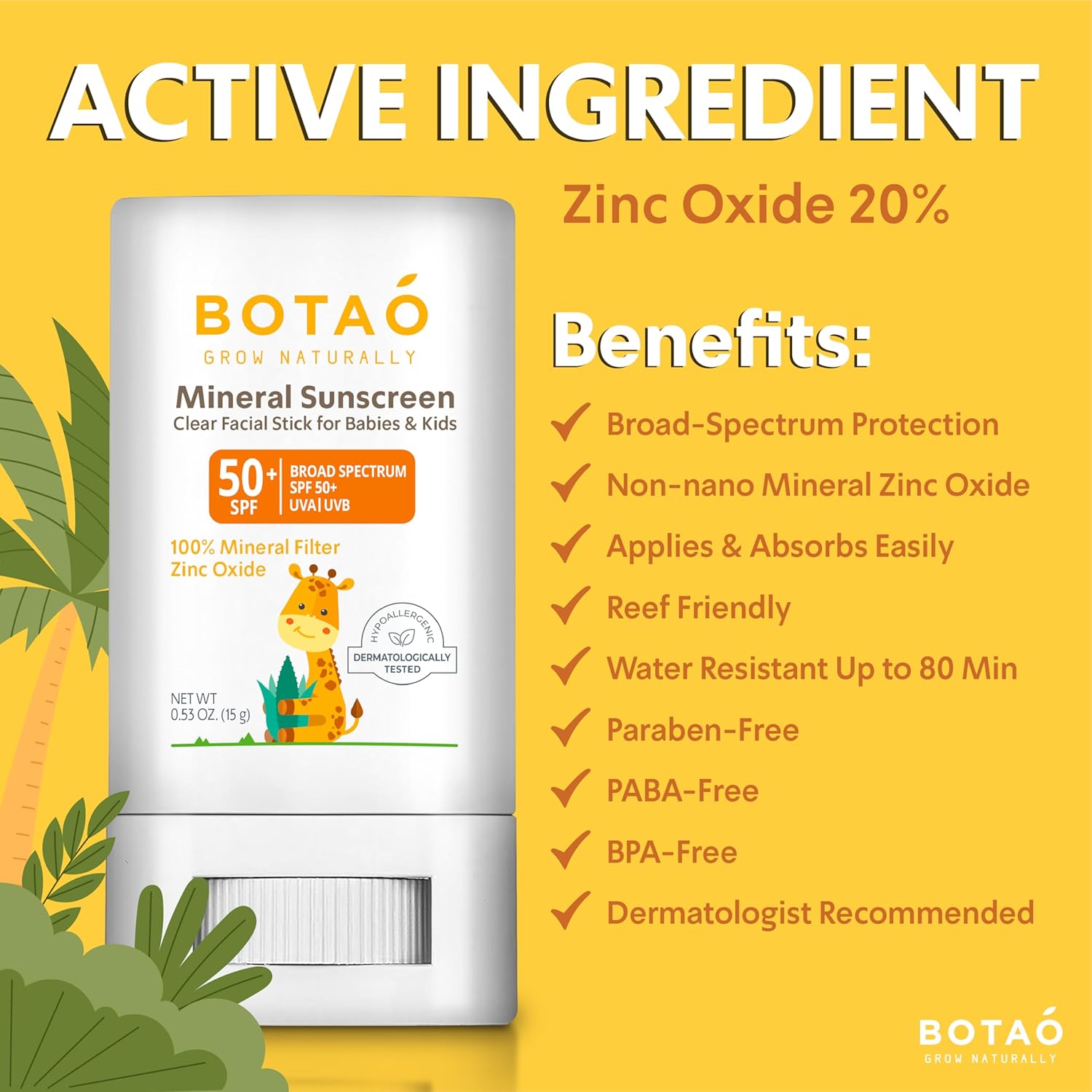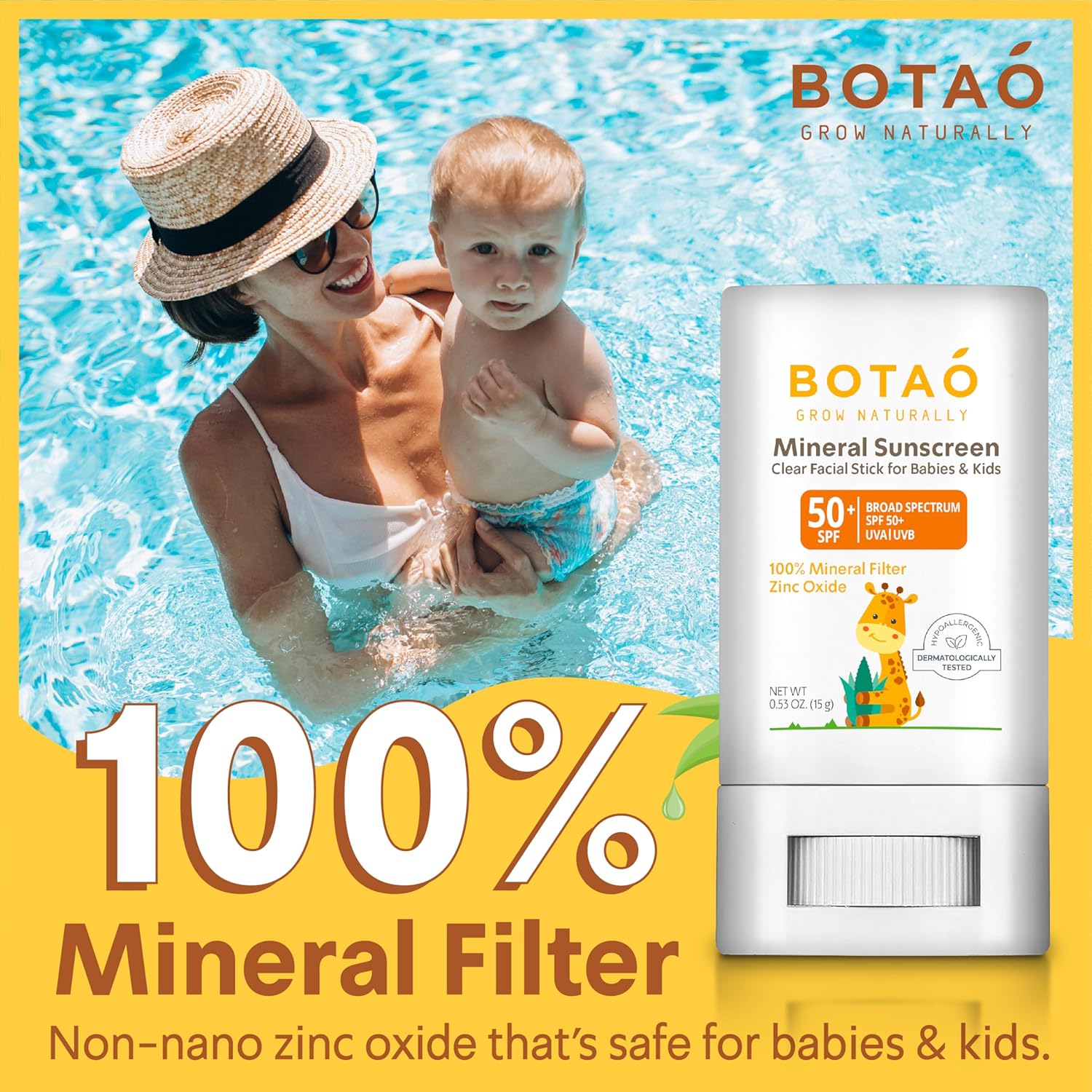- NATURAL PROTECTION: Botao baby mineral sunscreen provide effective SPF 50+ sun protection for babies & kids, broad spectrum against UVA + UVB RAY EASY APPLICATION: Supplied as a convenient sunscreen stick, the hydrating sun cream is quick and easy to apply The fast absorbing sun lotion wonβt leave skin feeling oily or sticky CLEAN MINERAL FORMULA: NO: PABA parabens phthalates BPA oxybenzone, avobenzone, petroleum, gluten, dairy, or toxic chemicals. ITS UNSENTED FOR SENSETIVE SKIN- BOTAO BABY mineral sunscreen stick is tested for babies sensetive skin WATER RESISTANT : 80 MINUTES