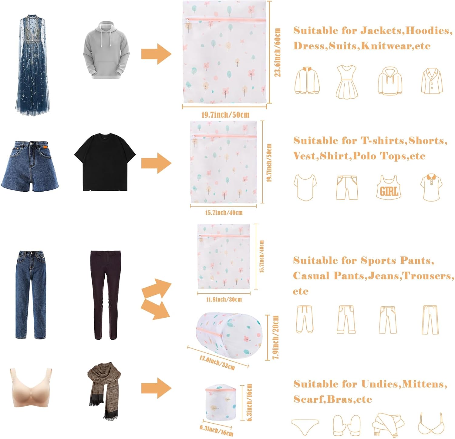 - 5 Different Size: 1 Extra Large Size 24"x 20",1 Large Size 20"x 16", 1 Medium Size 16"x 12", 1 Bra Bag6"x 6", 1 Large Round Bag 8.6"x 13"; The wash bags can meet most families’ demand