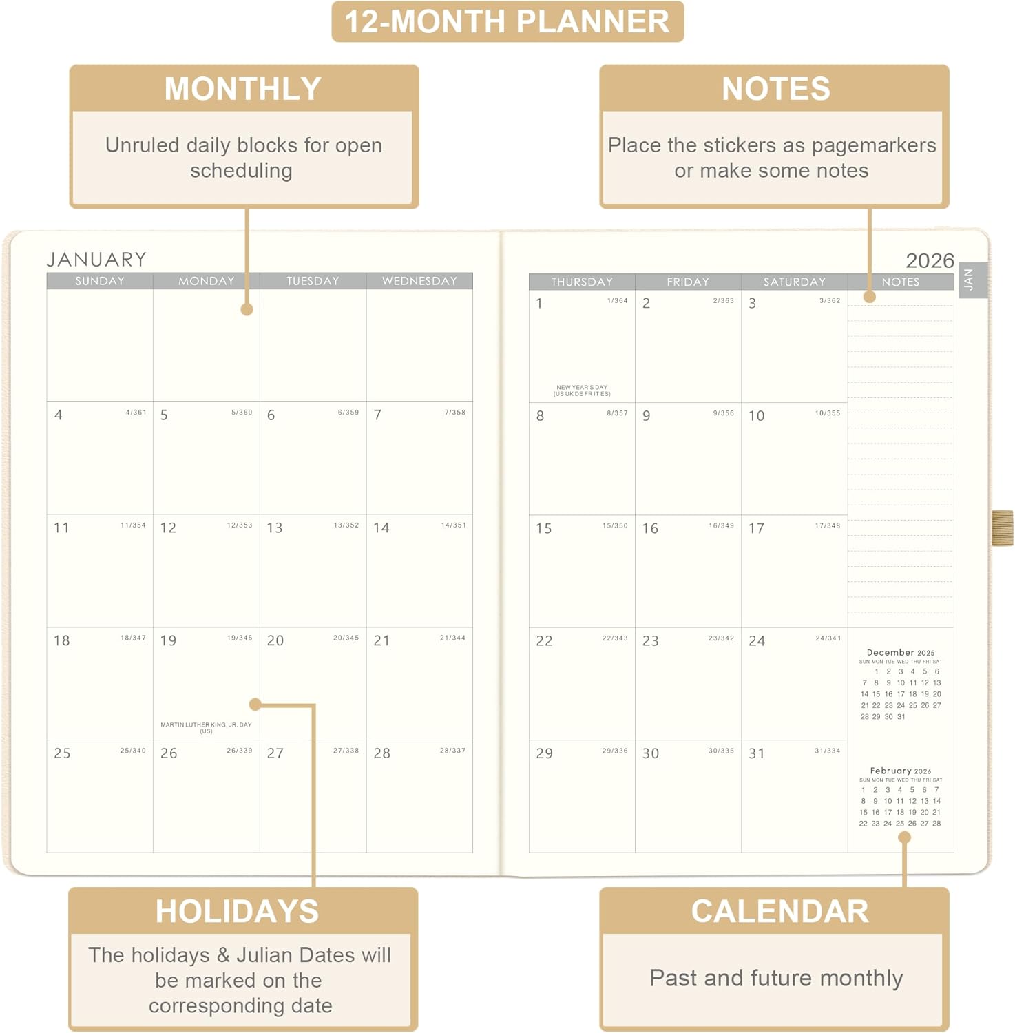 - β¨ The elastic closure of planner 2026 keeps it securely closed | The elastic pen loop is always available for your pen | held well | You can make a better mark with 2 bookmarks | calendar stickers | Exquisite box | Inner pocket, it is convenient for you to pack business cards stickers - 8" x 11" in.