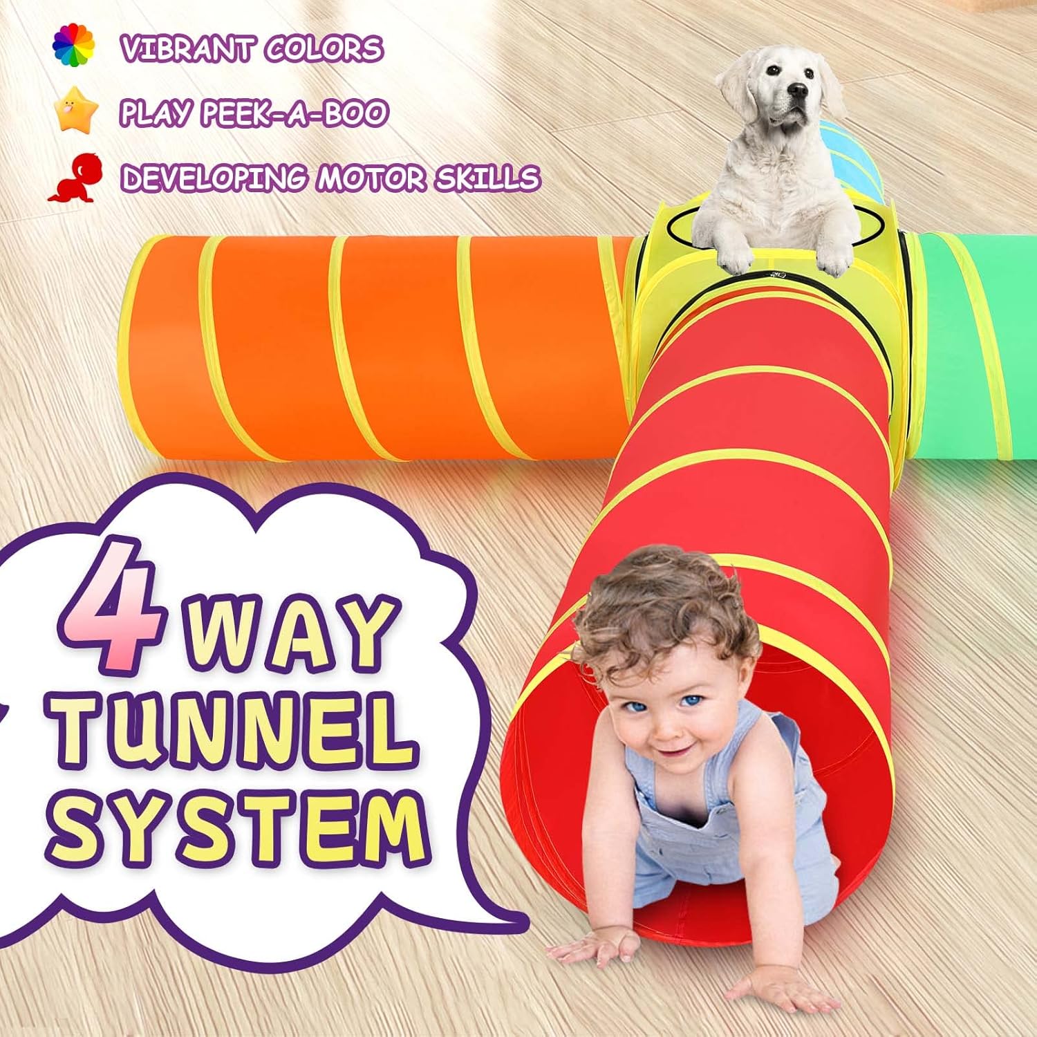 - 【Fun and Interactive】Children can crawl, chase, and Hide and seek in the kid tunnels indoor and outdoor. Not only can exercise children’s body crawling ability but also can train children’s ability to judge direction. This will be the best for boys and girls of the fun toy to crawl and play with. If you have any questions about our 4 way tunnel, we’re always happy to help you!