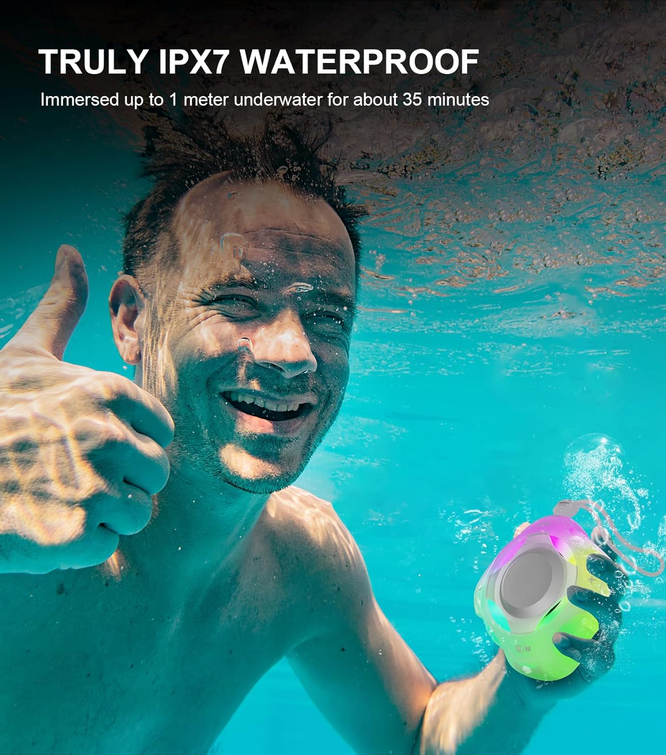 - [ EQ MULTI-COlOR LIGHT SHOW ] - Simply press the "Light Button" to enable the colored LED lights and press again to switch the light mode to make your party more fun. The multi-color LED light change allows you to enjoy the LED light show anytime during the day or night. Start the party with powerful sounds and rock the party with multi-color flashing lights. Perfect for use in family parties and take to pool parties or beach parties.