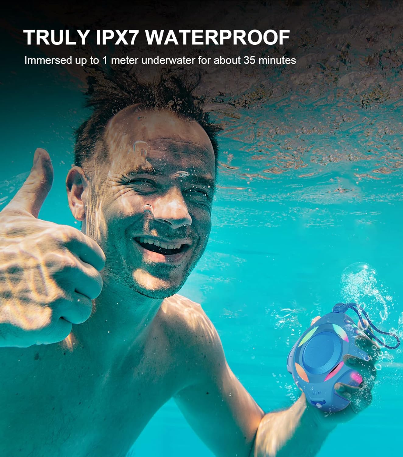 - [IPX7 Waterproof Speaker Floatability] The waterproof shower speaker is IPX7 waterproof and has been rigorously tested to withstand complete immersion in one meter of water for 30 minutes and can even float on the surface of the water. This portable speaker, waterproof, dustproof, sweatproof, rainproof, snow proof, suitable for most environments, ideal for pool sports, kayaking, bathrooms, beaches, boating, camping and travel.