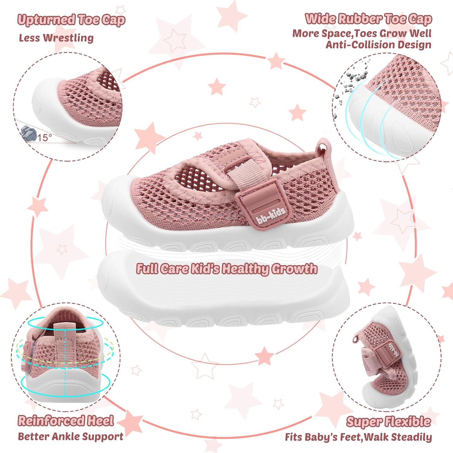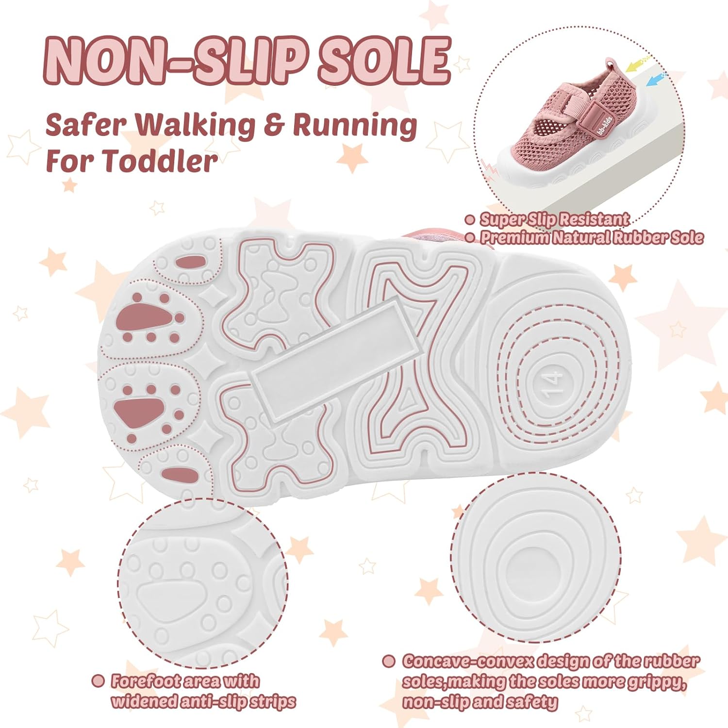 - Breathable Upper: The toddler walking shoes feature a breathable mesh upper that quickly absorbs sweat. Cut-outs enhance the breathability of the baby shoe, ensuring your baby stays fresh all day. Easy to clean and machine washable, making them convenient for busy parents.