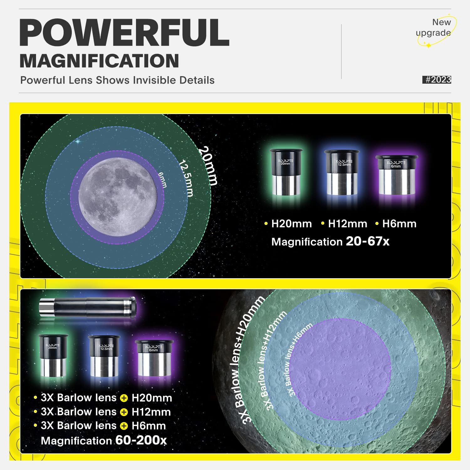 - 20X-200X Magnification: The telescope equipped with 3 eyepieces(K6mm, K10mm, K25mm) and a 3X Barlow lens that can triple the magnifying power of each eyepiece. The telescope meets all the needs of astronomy beginners and is the best helper for children, adults and beginners in astronomy.