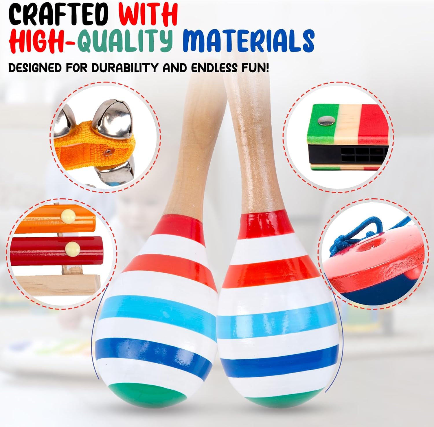 - Wooden toddler musical instruments for kids contains: 1 harmonica, 1 xylophone with 2 sticks, 2 maracas, 2 egg shaker, 2 finger clappers, 1 tambourine, 2 wrist bells and a triangle with a striker