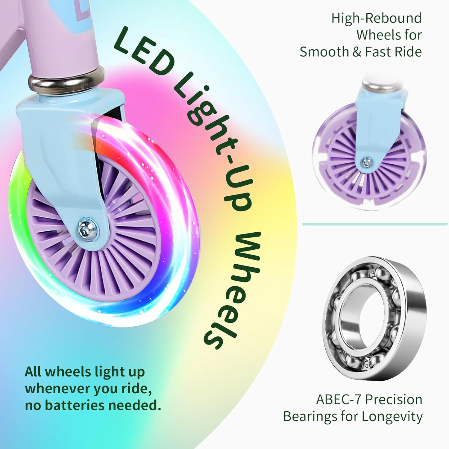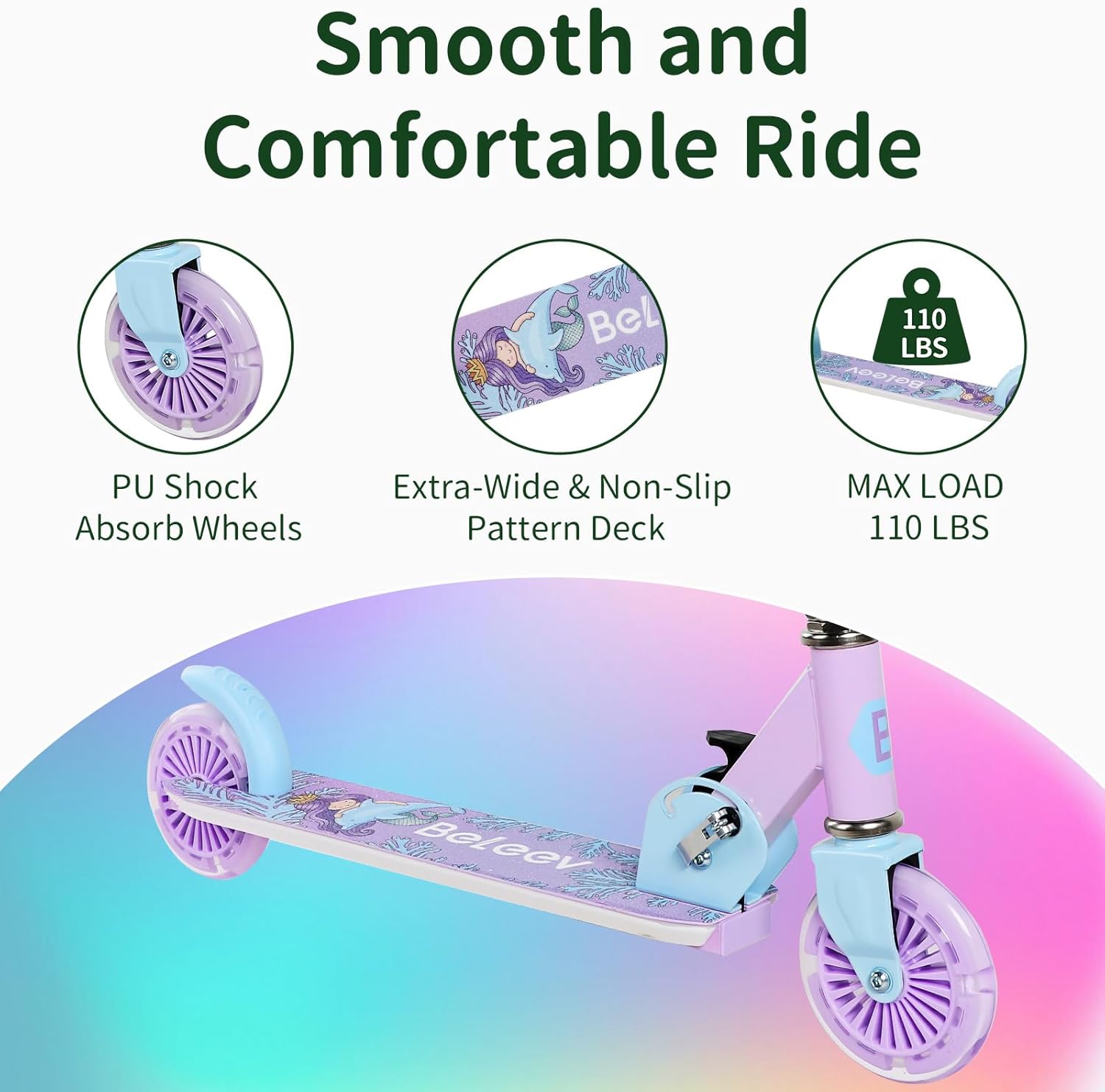 BELEEV V2 Scooters for Kids with Light-Up Wheels & Stem & Deck, 2 Wheel Folding Scooter for Girls Boys, 3 Adjustable Height, Non-Slip Pattern Deck, Lightweight Kick Scooter for Children Ages 3-12