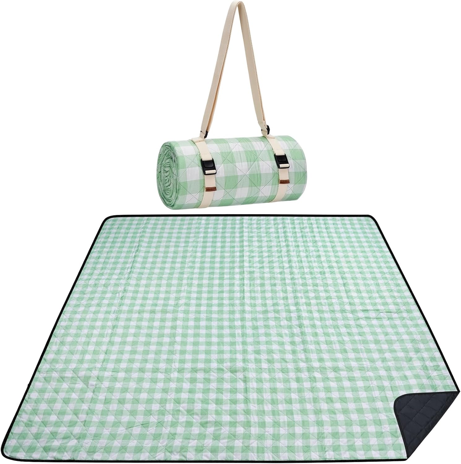 - HIGH QUALITY FABRIC: The top fabric is made of durable polyester, and printed with classic neutral green white check, the color printed is safe and fastened, not easy to fade as time goes. The soft cotton padded in the middle, making the picnic blanket soft and comfortable to sit and lie down.