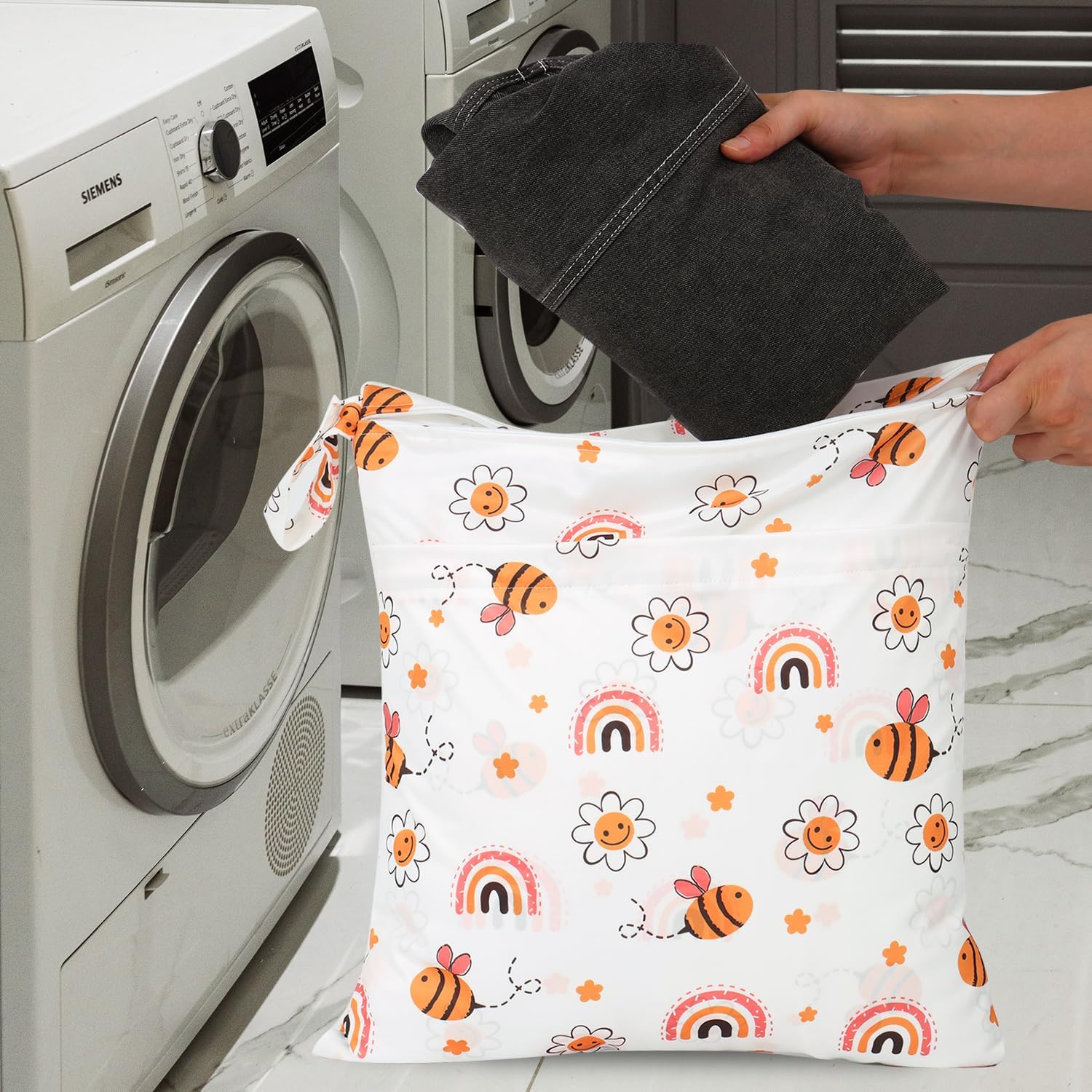 • 2 ZIPPERED POCKETS & HANDLE DESIGN: The 2 pack laundry bags are designed with 2 zippered compartments to keep wet and dry clothes separately, or separate dirty and clean diapers. Keep dry and clean. There's a handle with a button on one side for hanging up, convenient to carry and attach to your stroller, doorknob, towel rack, hook or handbag.