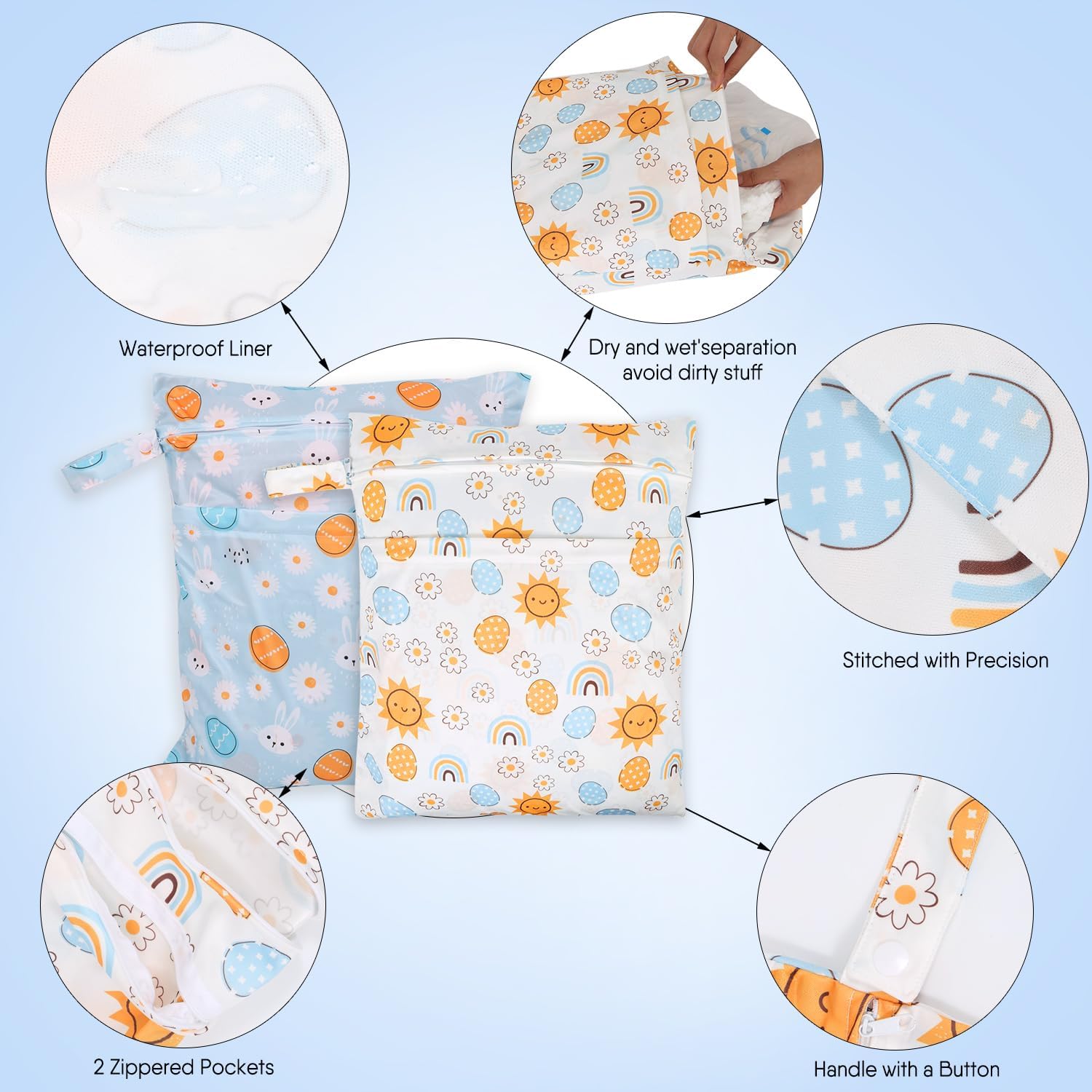 - 2 ZIPPERED POCKETS & HANDLE DESIGN: The 2 pack laundry bags are designed with 2 zippered compartments to keep wet and dry clothes separately, or separate dirty and clean diapers. Keep dry and clean. There's a handle with a button on one side for hanging up, convenient to carry and attach to your stroller, doorknob, towel rack, hook or handbag.