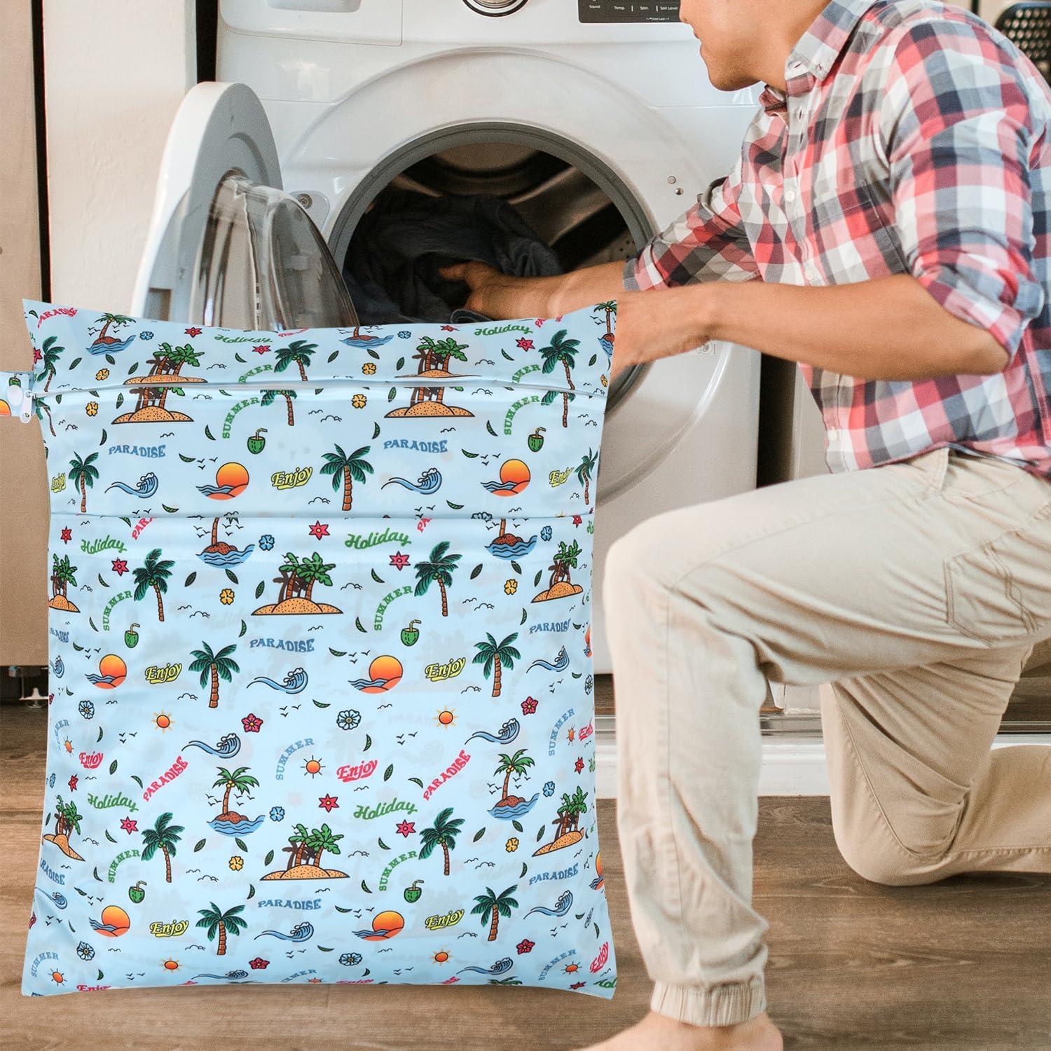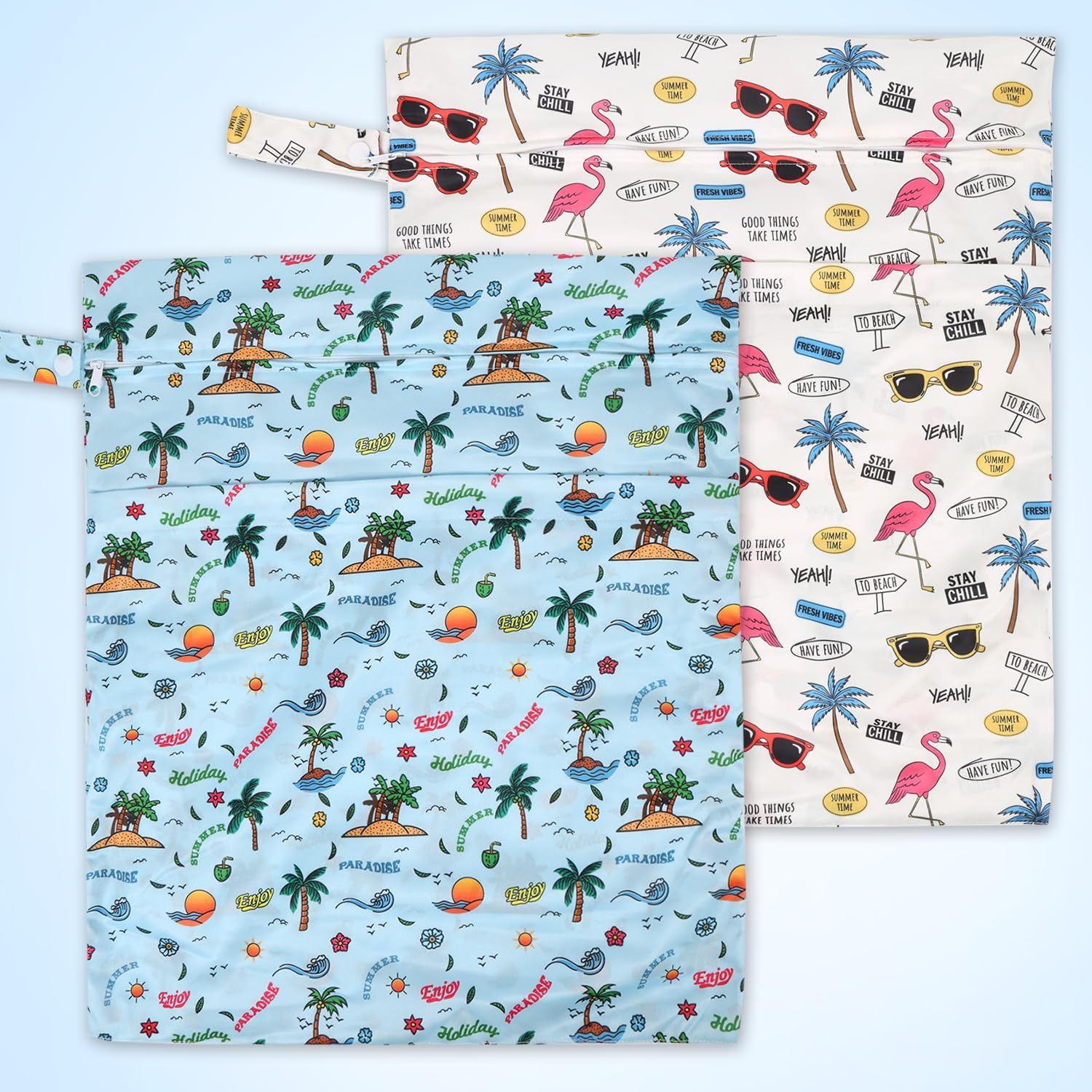 - 2 ZIPPERED POCKETS & HANDLE DESIGN: The 2 pack laundry bags are designed with 2 zippered compartments to keep wet and dry clothes separately, or separate dirty and clean diapers. Keep dry and clean. There's a handle with a button on one side for hanging up, convenient to carry and attach to your stroller, doorknob, towel rack, hook or handbag.