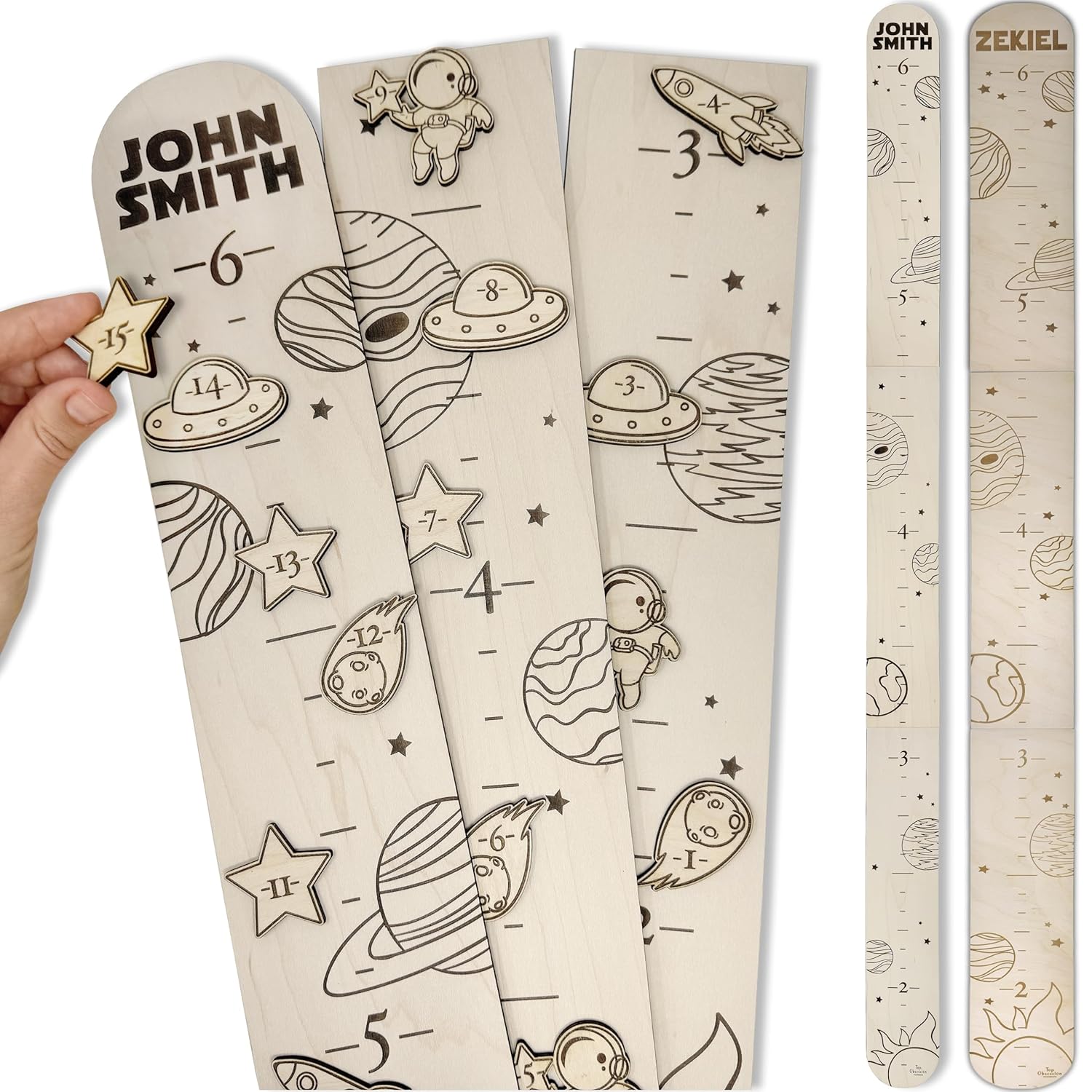 - Optional set of 16 wooden markers: Presented in various forms, such as stars, meteors, rockets, starships(UFOs), and astronauts, can be attached to kids height wall chart with double-sided tape, to order an extra set of markers, scroll down the product detail page