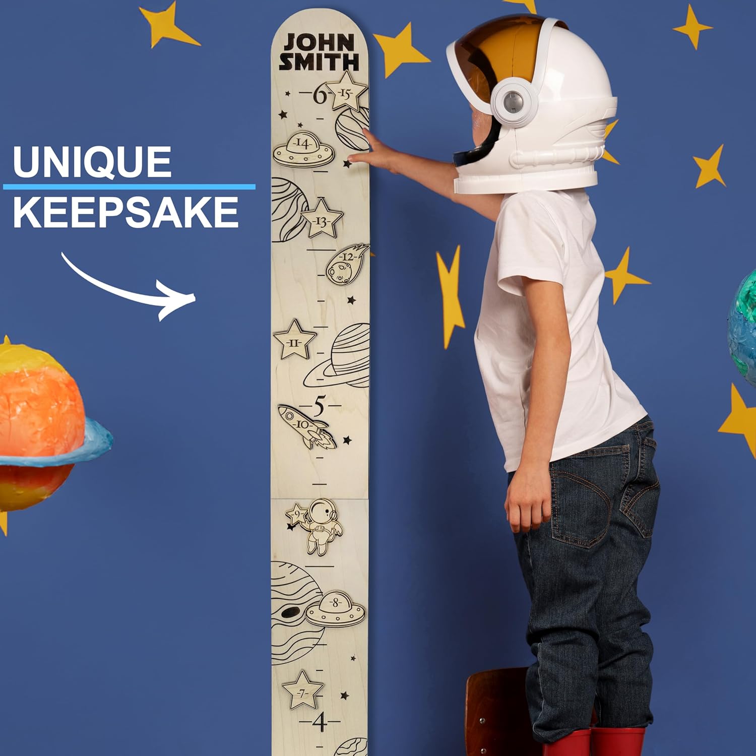 - Material, size, measurement: This space height chart for kids is crafted from high-quality plywood in a natural wood color with a smooth, sanded surface for a premium finish, available size: 56 in x 3,5 in x 0,15 in or 57 in x 5,5 in x 0,25 in., measurement units: inches and feet the ruler starts from 19 in and the height can be measured up to 6ft