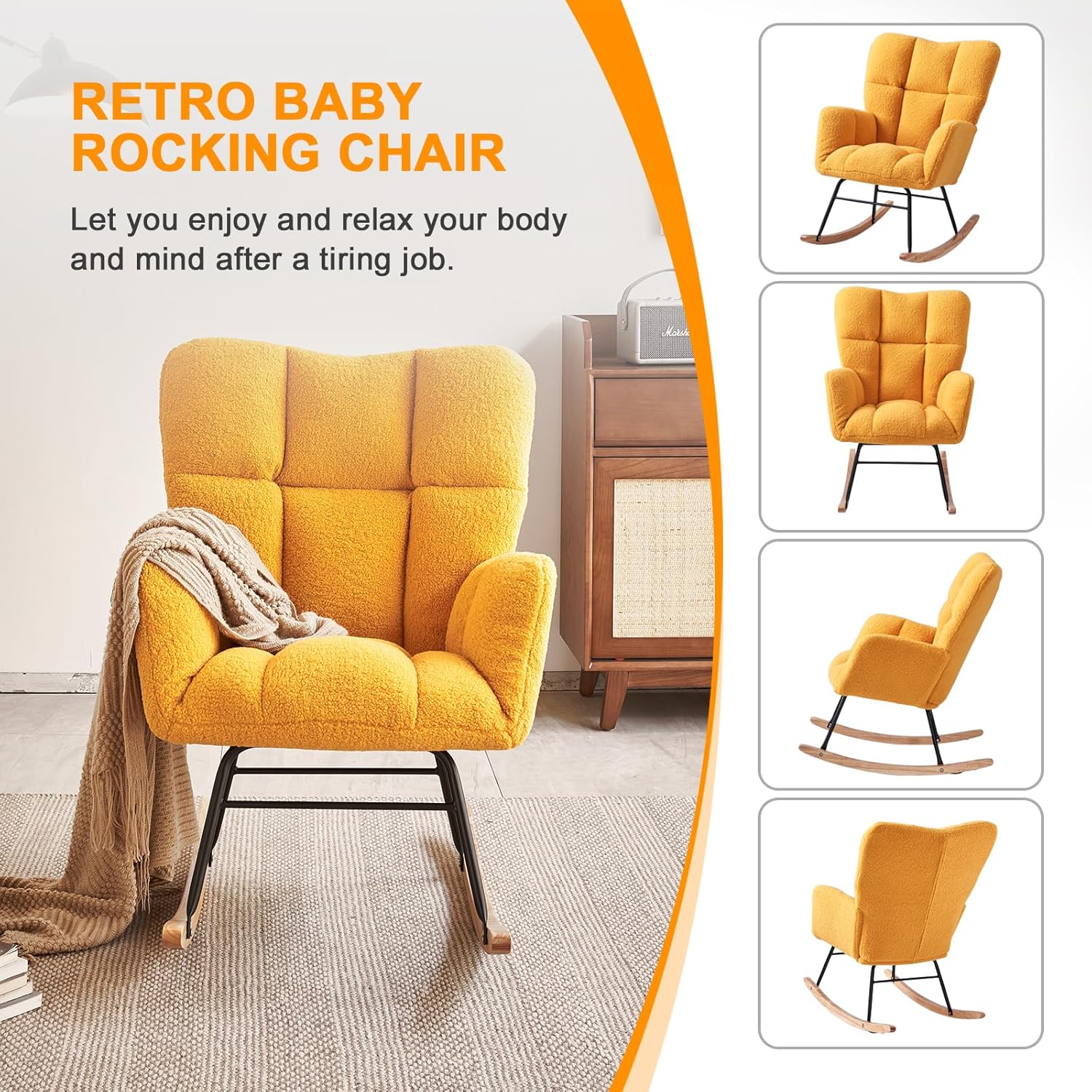 Nursery Rocking Chair, Teddy Fabric Upholstered Glider Rocker with High Backrest, Modern Rocking Accent Chairs Comfy Side Chair for Nursery, Bedroom, Living Room (Yellow)