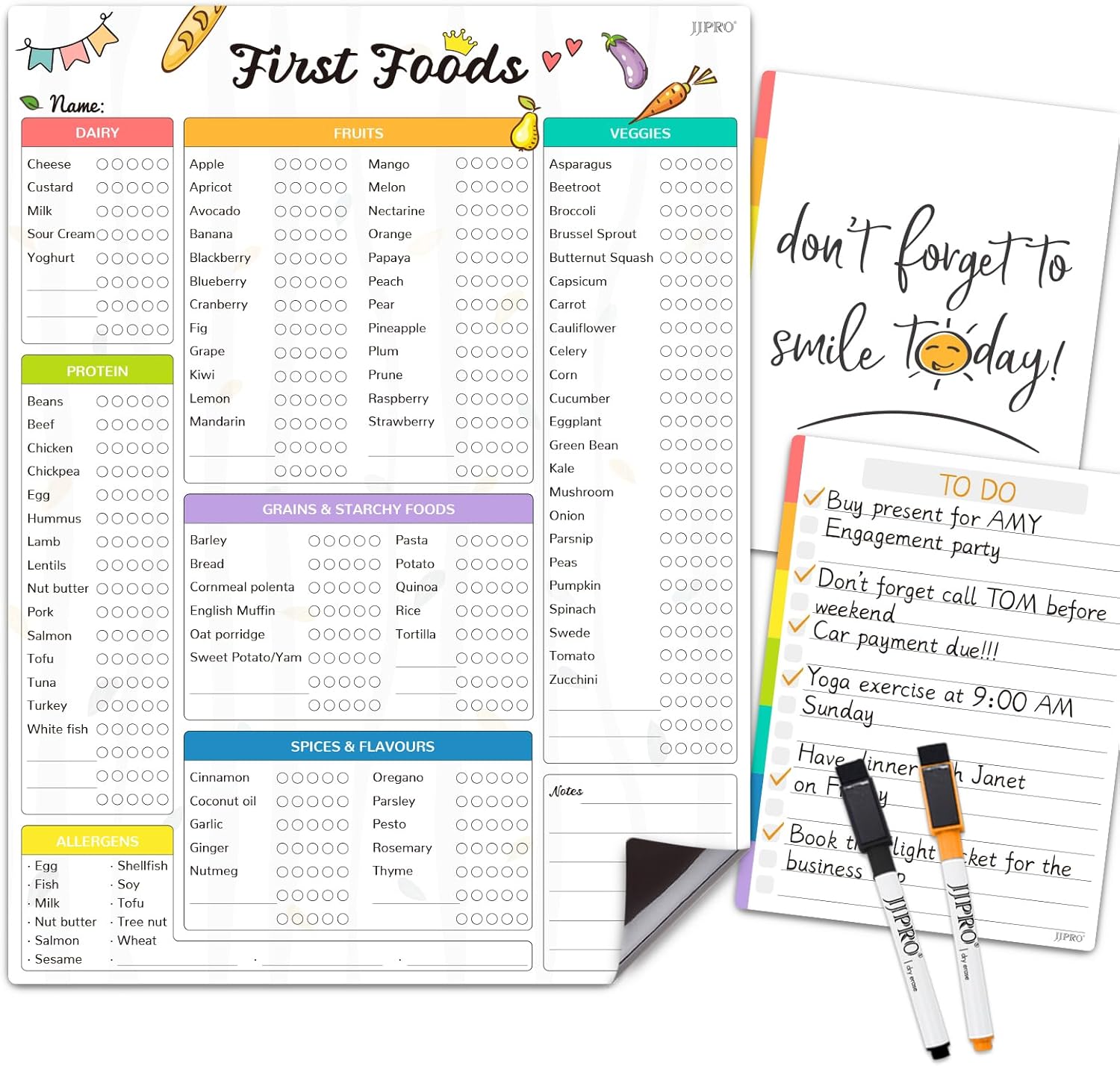 - EFFECTIVE COMBO SET- One first foods tracker for baby & Two notepad whiteboards, all with strong magnetic backing. The combo set fits most refrigerators. The magnetic, dry erase food log (14.5" x 11") is the perfect size to fit your fridge.