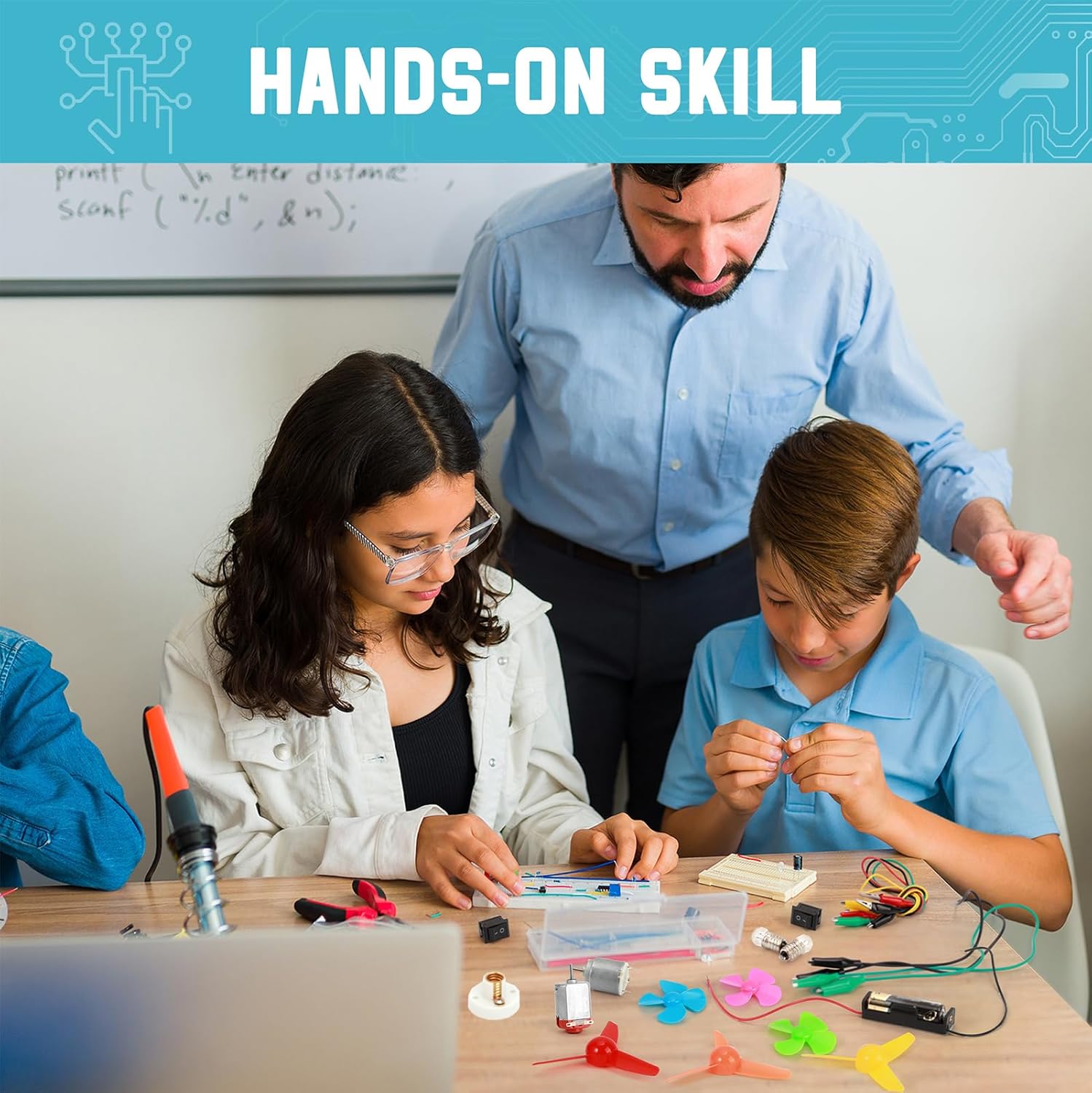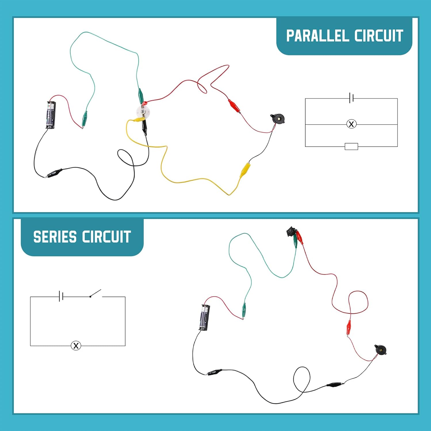 - Complete Circuit Kit: Comes with a designed box including 5 x crocodile clip leads, 5 x bulbs, 2 x motors, 2 x motor holders, 2 x rocker switches, 3 x propellers with 3 Vanes, 3 x propeller with 4 Vanes, 1 x buzzer sounder, 1 x bulb holders, AA size battery holder (1 x 1.5V), AA size battery holder (2 x 1.5V), making it a complete package for children to start experimenting with circuits