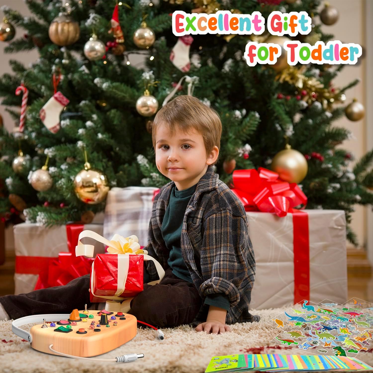 - Montessori-inspired : Flycoost busy board follows the principles of Montessori education, emphasizing child-led learning and sensory development, allowing your little family to experience different fun while playing, Montessori busy board toys come with 17 LED lights and 10 open board buttons, with animal learning cards and dinosaur stickers, educational activity travel toys for boys and girls from 1 year old.