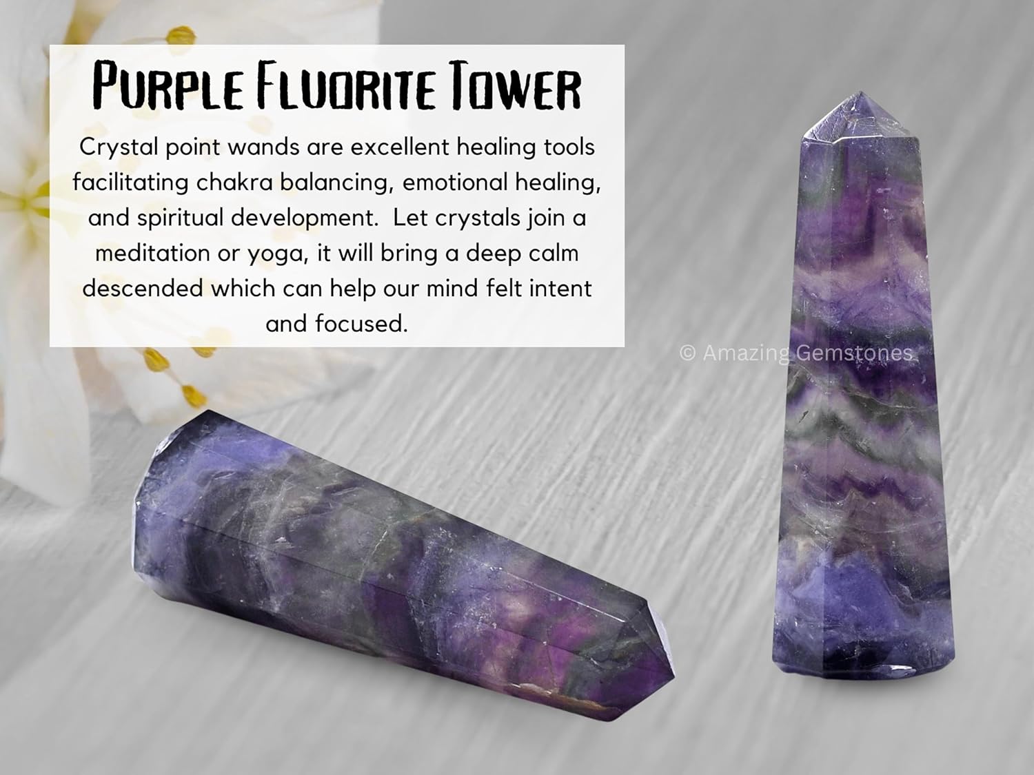 - Purple Fluorite Crystal Tower will uplift and purify the energy (if its point is not damaged), so you can place it in any area that needs to be re-energized with strong energy. Length of this tower / wand / obelisk / point is 3" inch to 4" inch (7.5cm to 10cm) & width is 0.75 inch (2 cm).