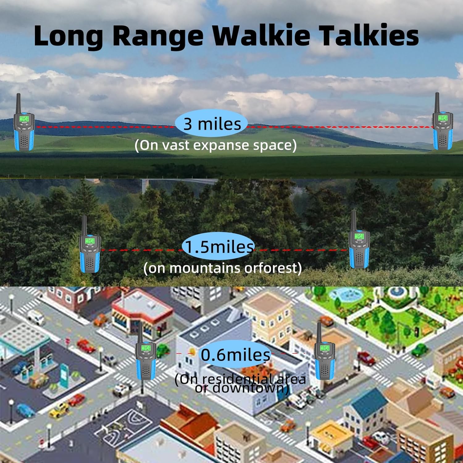 - Long Transmission Range: The walkie talkies a two-way radio with 22 channels, allowing for wireless communication up to 3 miles.The upgraded chipset greatly improved reception sensitivity and enhanced signal stability, You can enjoy clear sound quality.Terrain with large hills, low valleys, or mountains may affect the connection.