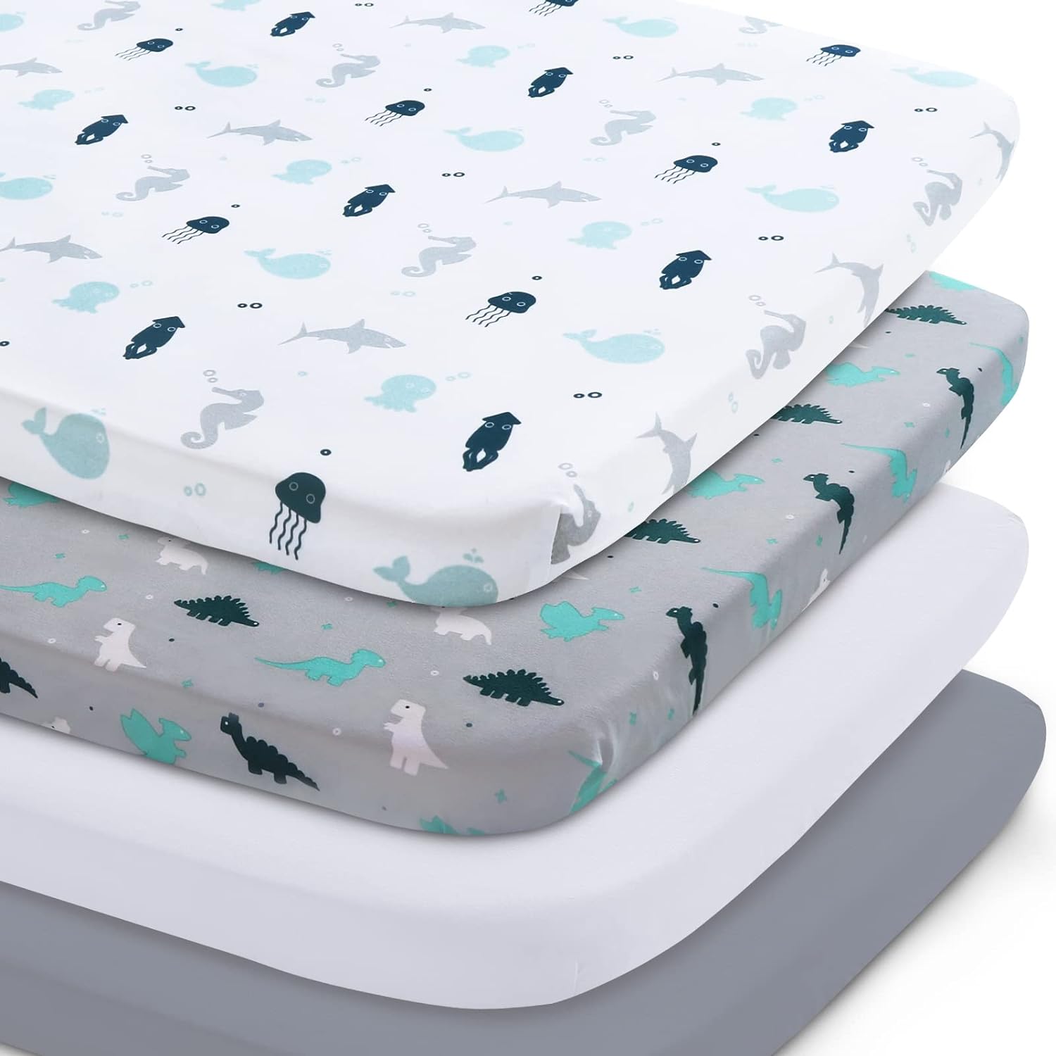- Super Soft & Quantity Options: These mini crib sheet sets 4 Pack have been carefully selected to be soft and breathable. No matter boy or girl, you can always find the best choice to match your playard bedding. We offer whales, dinosaurs, ocean, horses, pink, white, gray, aqua cute print. True to color. True to size.