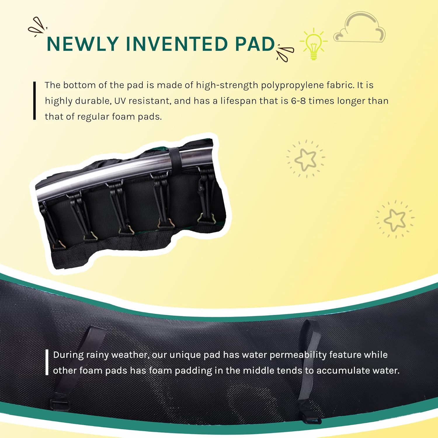 - [ Newly Designed Pad, HIGH-STRENGTH POLYPROPYLENE! ]: Highly durable, UV resistant, water-permeable and has a lifespan that is 6-8 times longer than that of regular foam pads. The pad is sewn with high-quality straps at the bottom, tightly wrapping around the frame to prevent loosening.