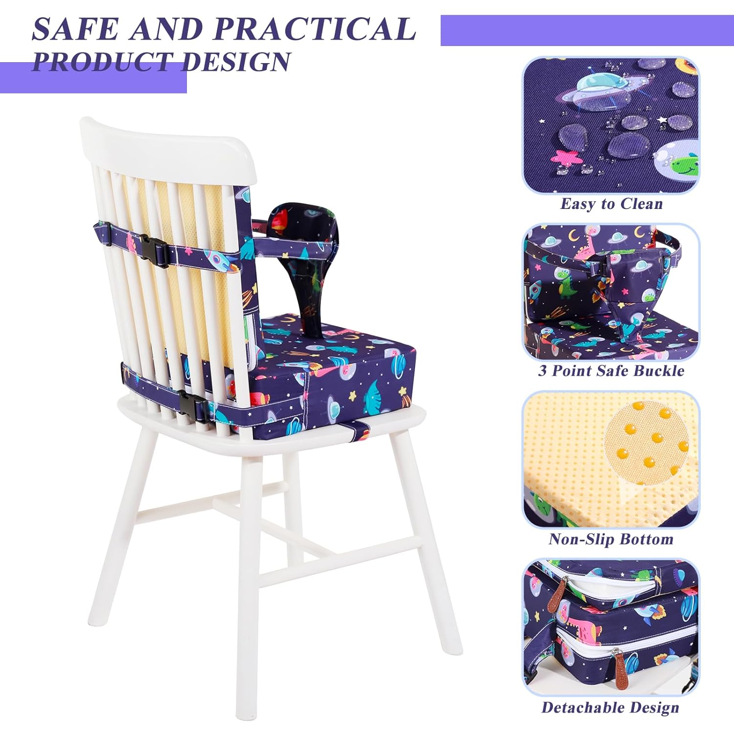 - [Safe to Eat]Say Goodbye to a traditional booster seat and regular highchair. Compared with other old models on the market, our booster seat has added backrests and 3-point harness strap. It prevents your little one from falling out of the chair and avoids accidents, seat belts A piece of fabric on the front also protects the kid's skin