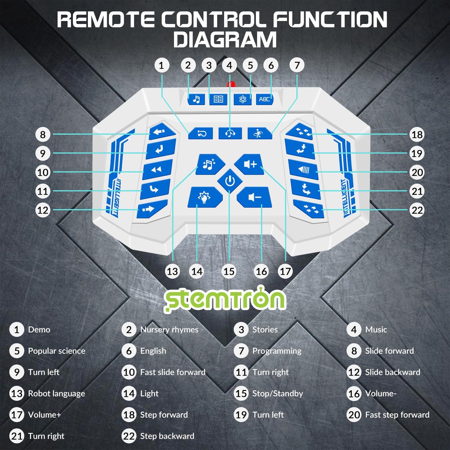 - [Intelligent Programmable Robot] This RC robot toy can demonstrate a series of actions that your kid has programmed. Besides, there are 5 Songs, 2 Jokes, 8 Light Music, 4 Science Stories and 5 Machine languages.