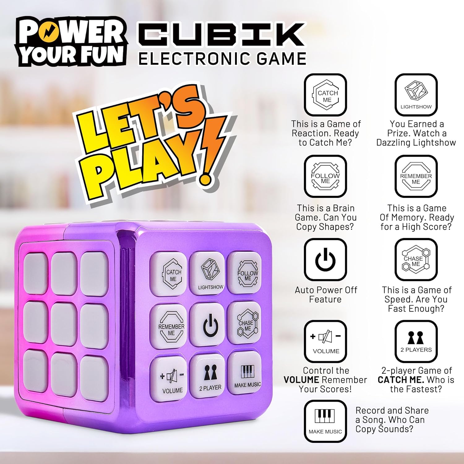 Power Your Fun Cubik LED Flashing Cube Memory Game - Electronic Handheld Game STEM Toy, 5 Brain Memory Games for Kids Brain Play Sensory Toys Puzzle Fidget Toy Light Up Cube (Metallic Pink/Purple)