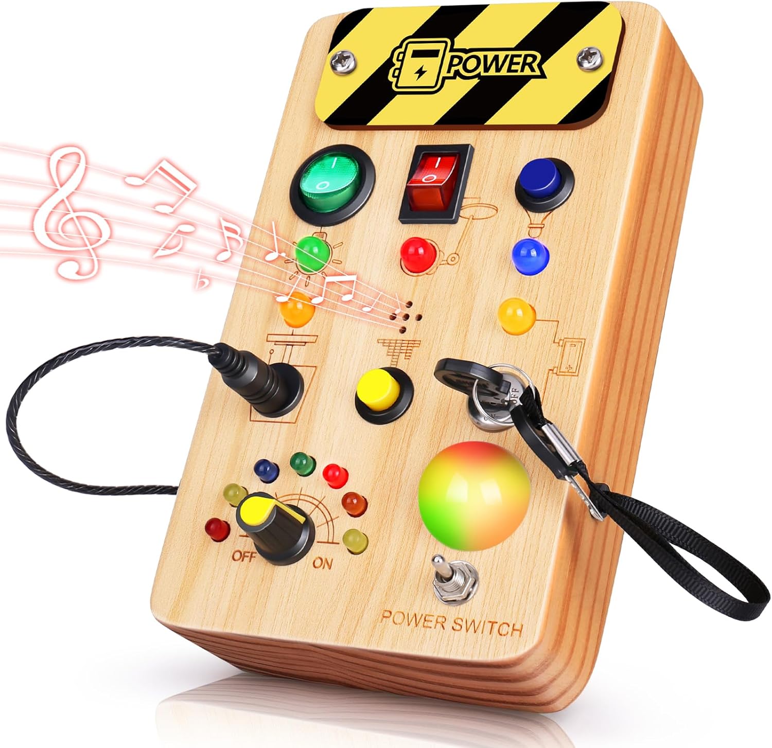 Busy Board Montessori Toys for Toddler, Wooden Sensory Board Switch Toy with Color-Changing LED Light Up Travel Toys Educational Plane Travel Activity for 1-6 Year Old Girls & Boys Gifts