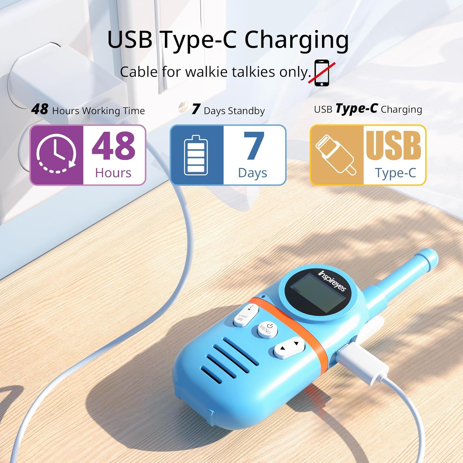 - Inspireyes rechargeable kids walkie talkies are rechargeable and long lasting, featuring an upgraded built-in lithium polymer battery. There is no need to buy extra AAA batteries. Kids can enjoy up to 48 hours of playtime and 7 days of standby on a single charge.
