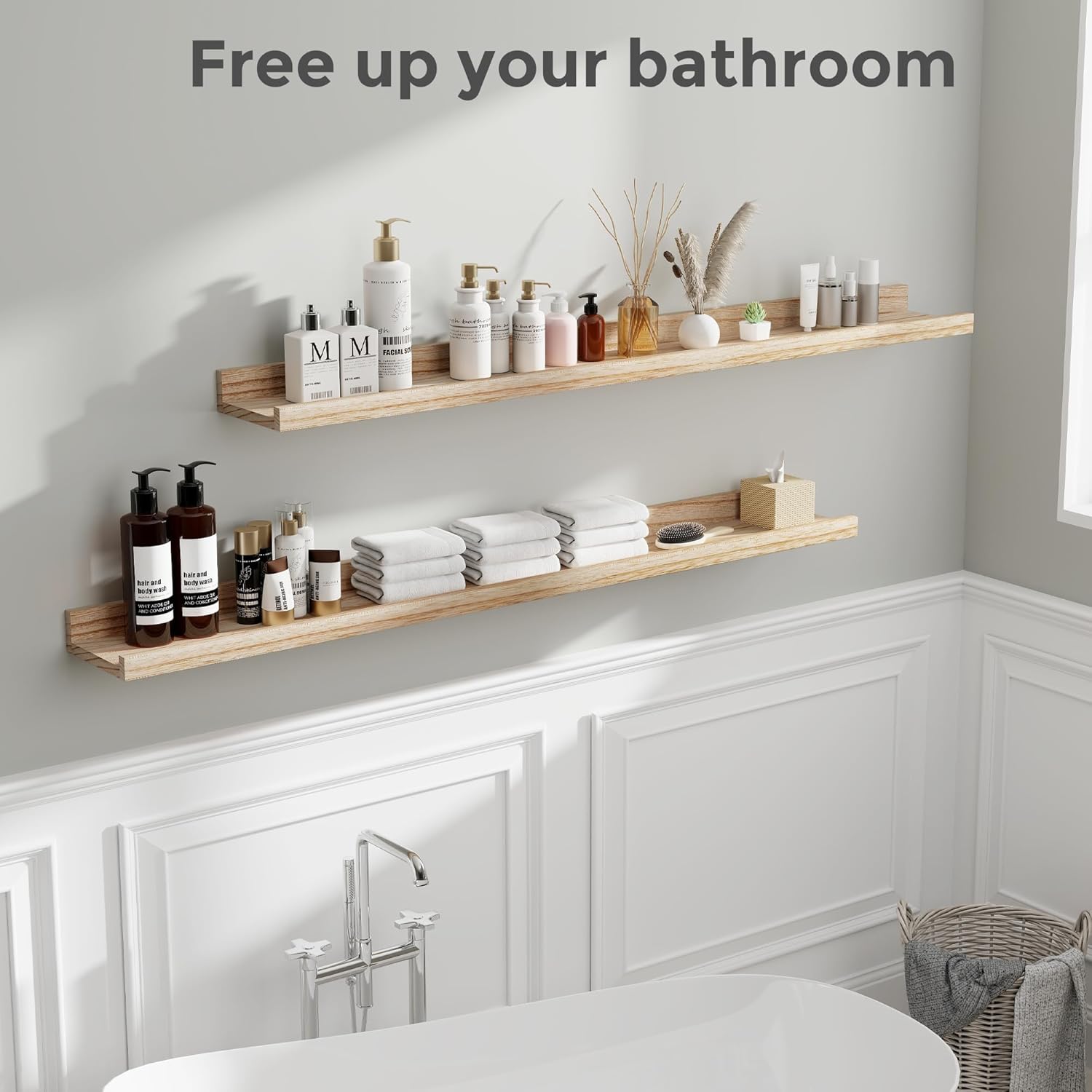 - 【Solid Wood Nursery Shelves】The wall shelves are crafted from Paulownia wood which are lightweight yet proportionately strong, sustainable real wood. The picture ledge wall shelf is SAME SIZE as each other (L 48" x D 5.12" x H 2.2") and is such an easy way to display photos without making lots of holes in your walls. They come fully assembled and all mounting hardware is included in the package.