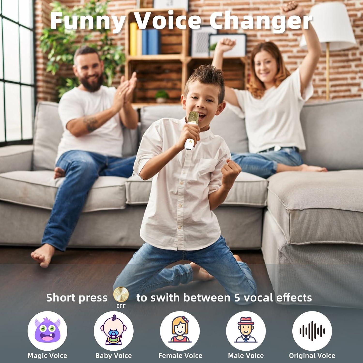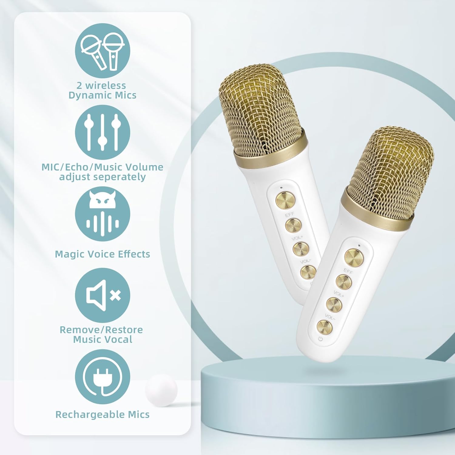 - ♪ 🎤【2 Interesting Microphones】Our mini karaoke microphones have seven kinds of magic voice effects: original, monster, baby, female, male, and 2 mixing, which can meet more needs and bring more fun. The voice changer microphone is perfect for in-car karaoke, home party, classroom, speeches, and many other occasions.