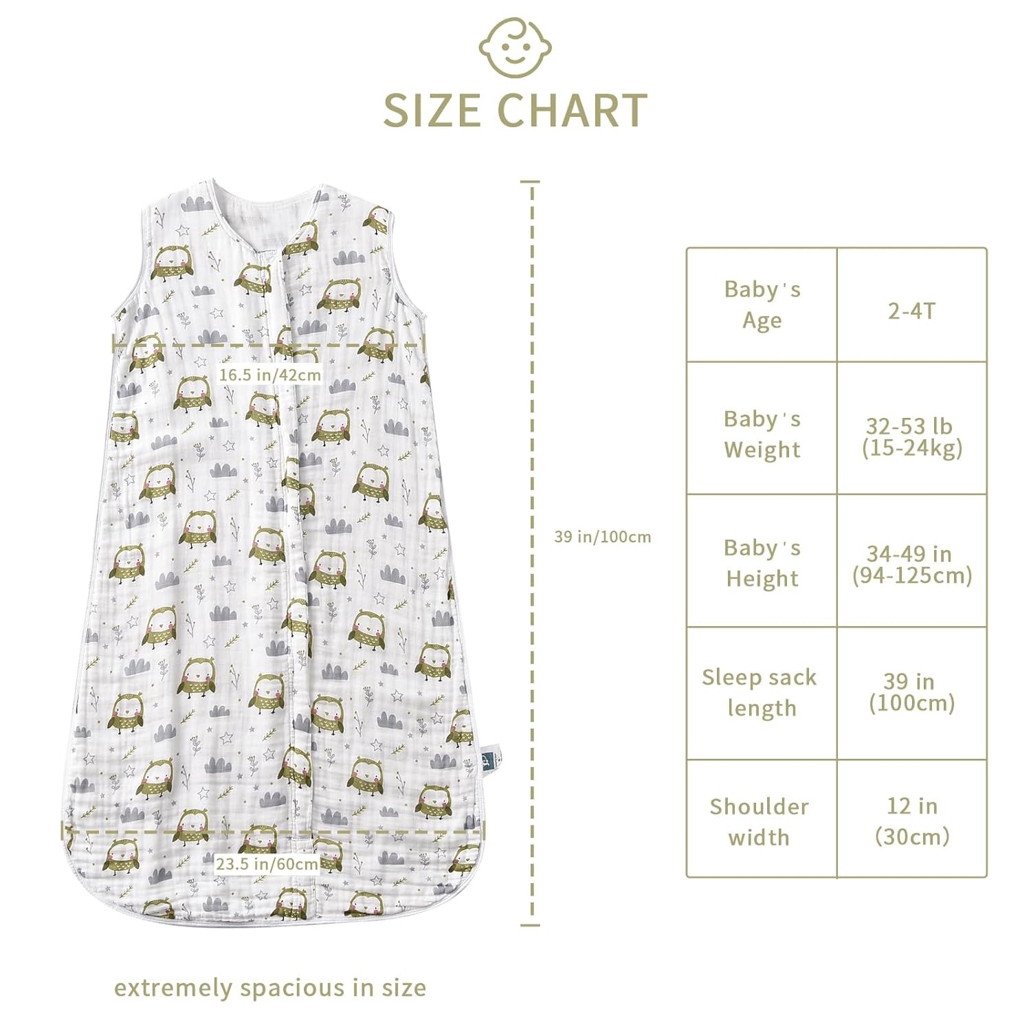 Baby Sleep Sack 2-4 T Baby Wearable Blanket 100% Organic Cotton 0.5 TOG Toddler Sleeping Sack 2- Way Zipper Soft Lightweight X-Large Owl