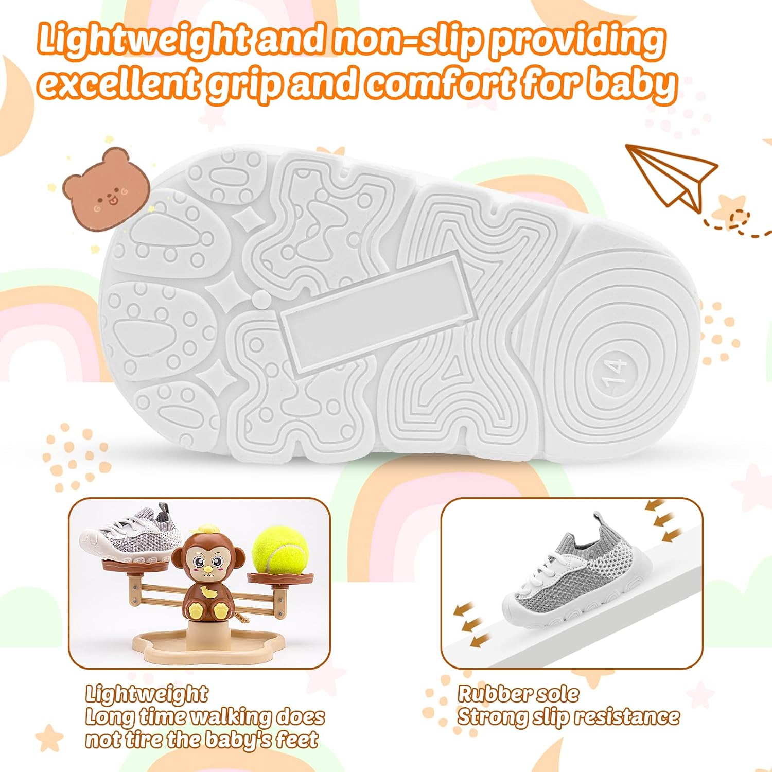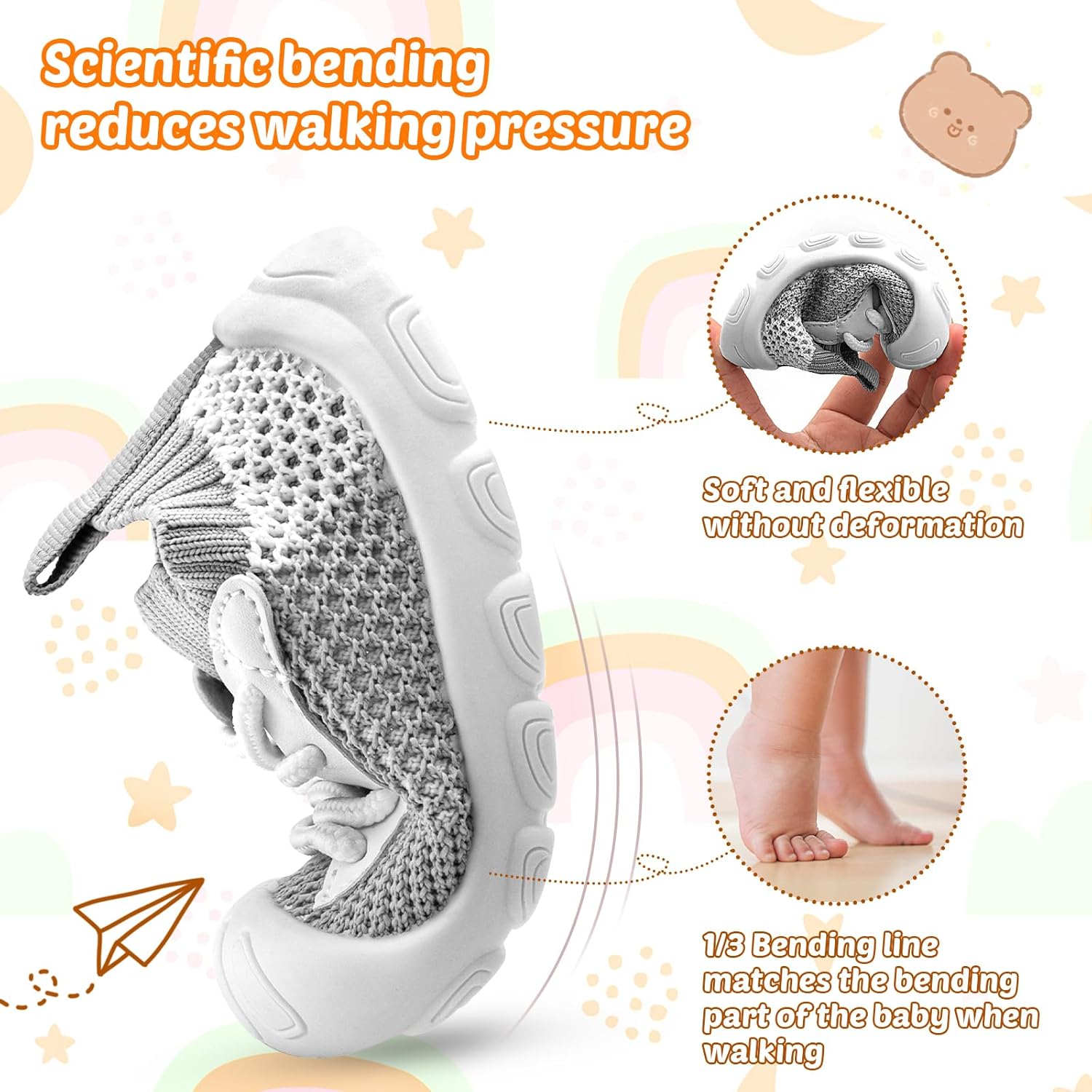 • Step into versatility with our Toddler Shoes, designed for both indoor play and outdoor exploration. Crafted from premium, safe knit, they offer a cozy hug for little feet. Engineered with scientific foot support, they're perfect for learning to walk, running, exercising, or playing anywhere. From crawling indoors to big adventures outside, these shoes inspire confidence with every giggly step.