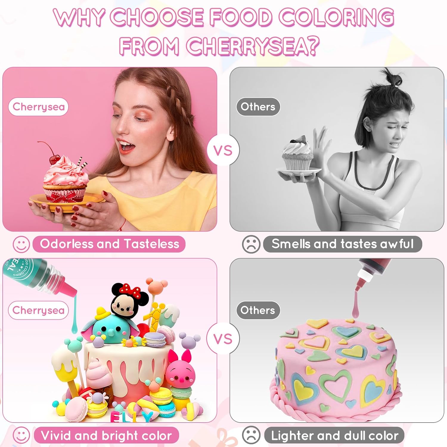 - Vibrant Cake Food Coloring - Approved by MSDS with food grade material.Non-toxic, dairy-free,nut-free,sugar-free and gluten-free. Food coloring set10 colors are odorless and tasteless.It doesn't change the taste of the food, just makes your desserts more lively and interesting. Any questions about how to add or use our baking food colors, please contact us via Amazon