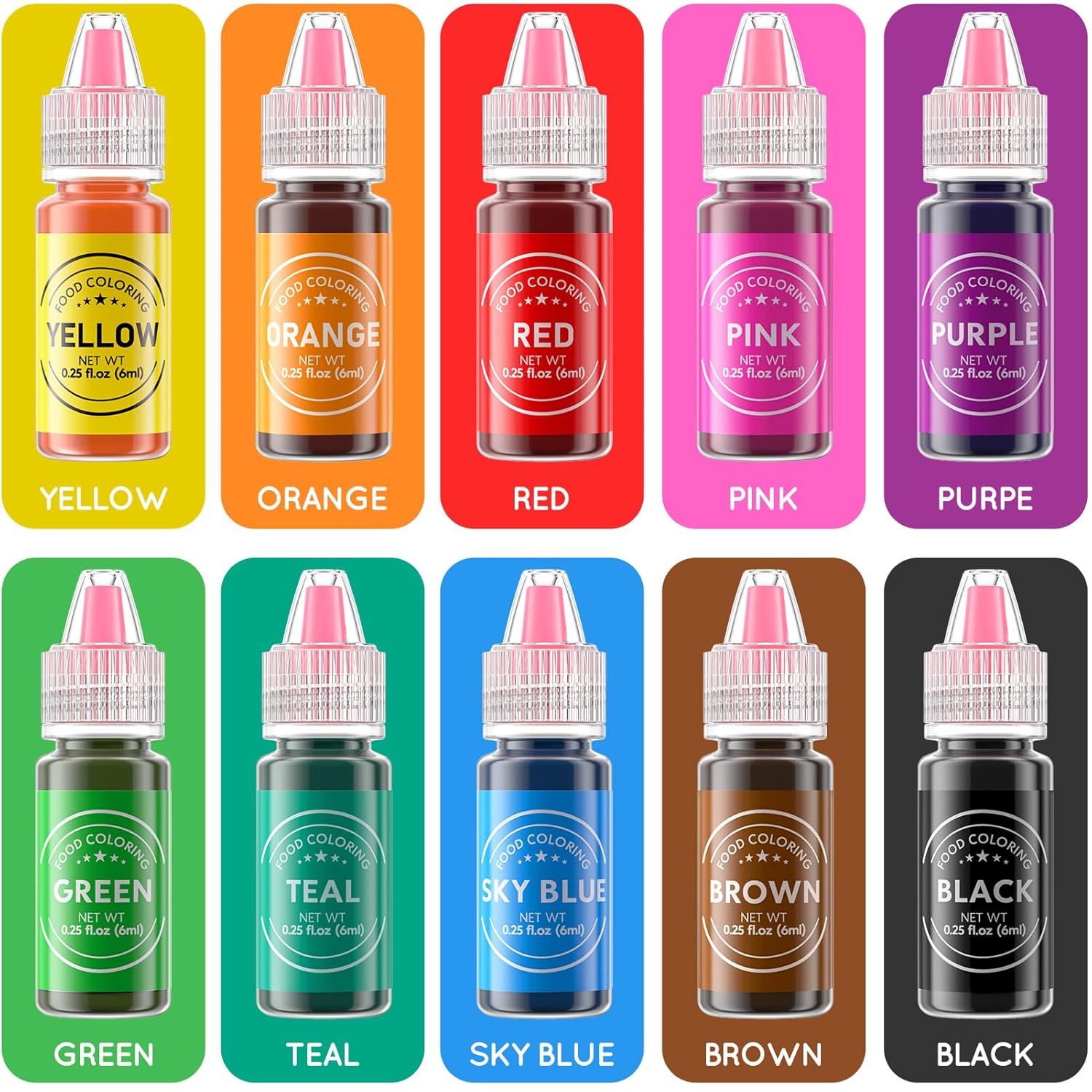 - Rich & Vivid Color Set - All colors are specially made by the Dessert Master,every color has its ingenuity. Our food coloring liquid set includes:Yellow, Orange, Red, SkyBlue, Green, Teal, Pink, Purple, Black, Brown