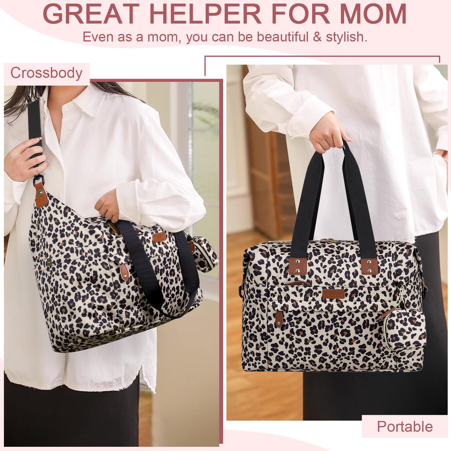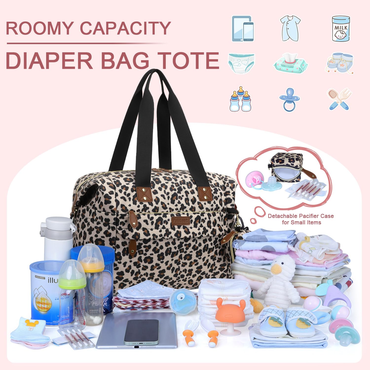 Diaper Bag Tote - Diaper Baby Bags with Pacifier Case, Shoulder Straps, Stroller Clips, Waterproof Large Mommy Maternity Travel Baby Bag for Mom and Dad, Leopard Print