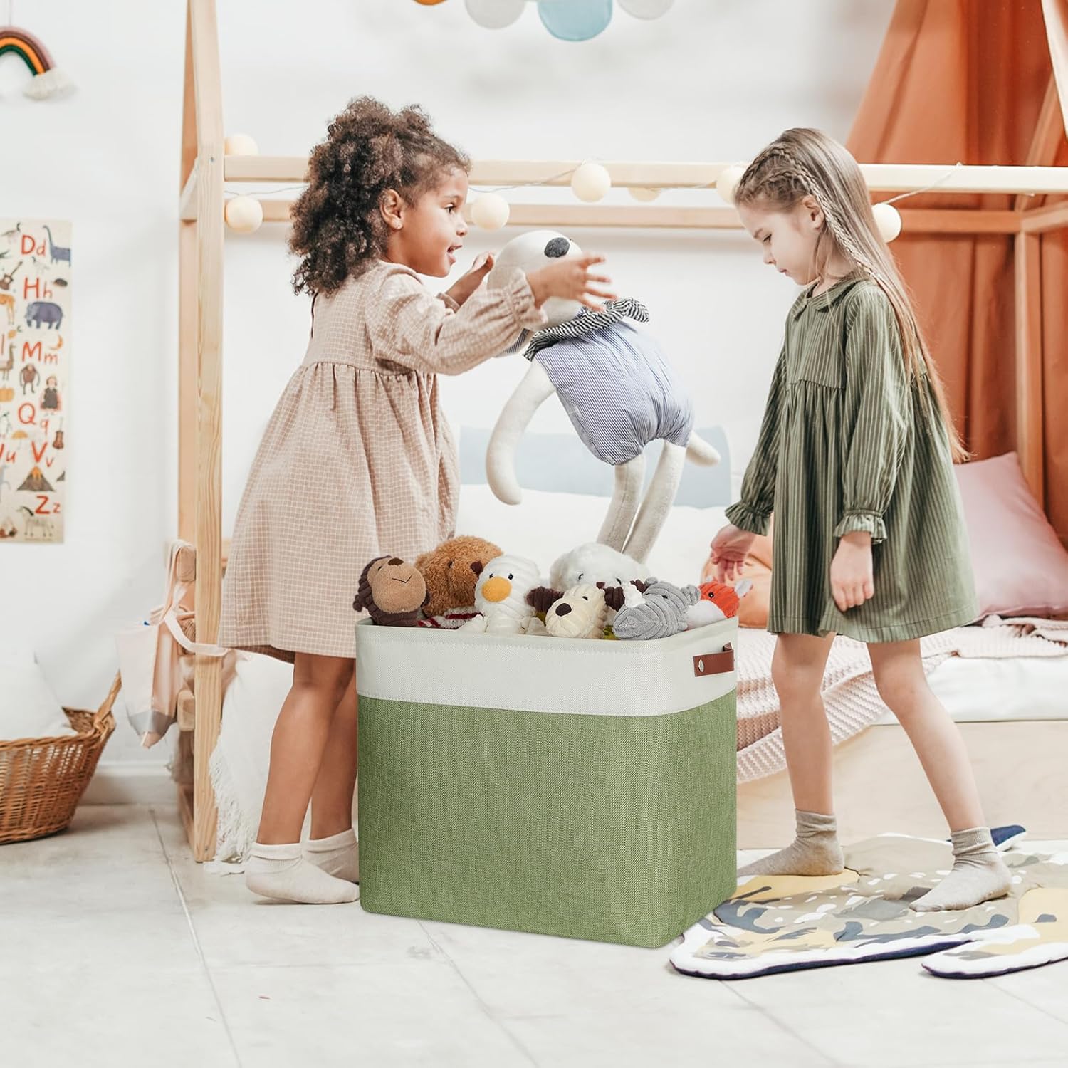 DULLEMELO Extra Large Storage Baskets, 17"x12"x15" Fabric Storage Bins for Organizing Shelves Nursery Toys Books, Collapsible Storage Baskets Rectangular Canvas Bins with Handles, White&Green, 2-Pack