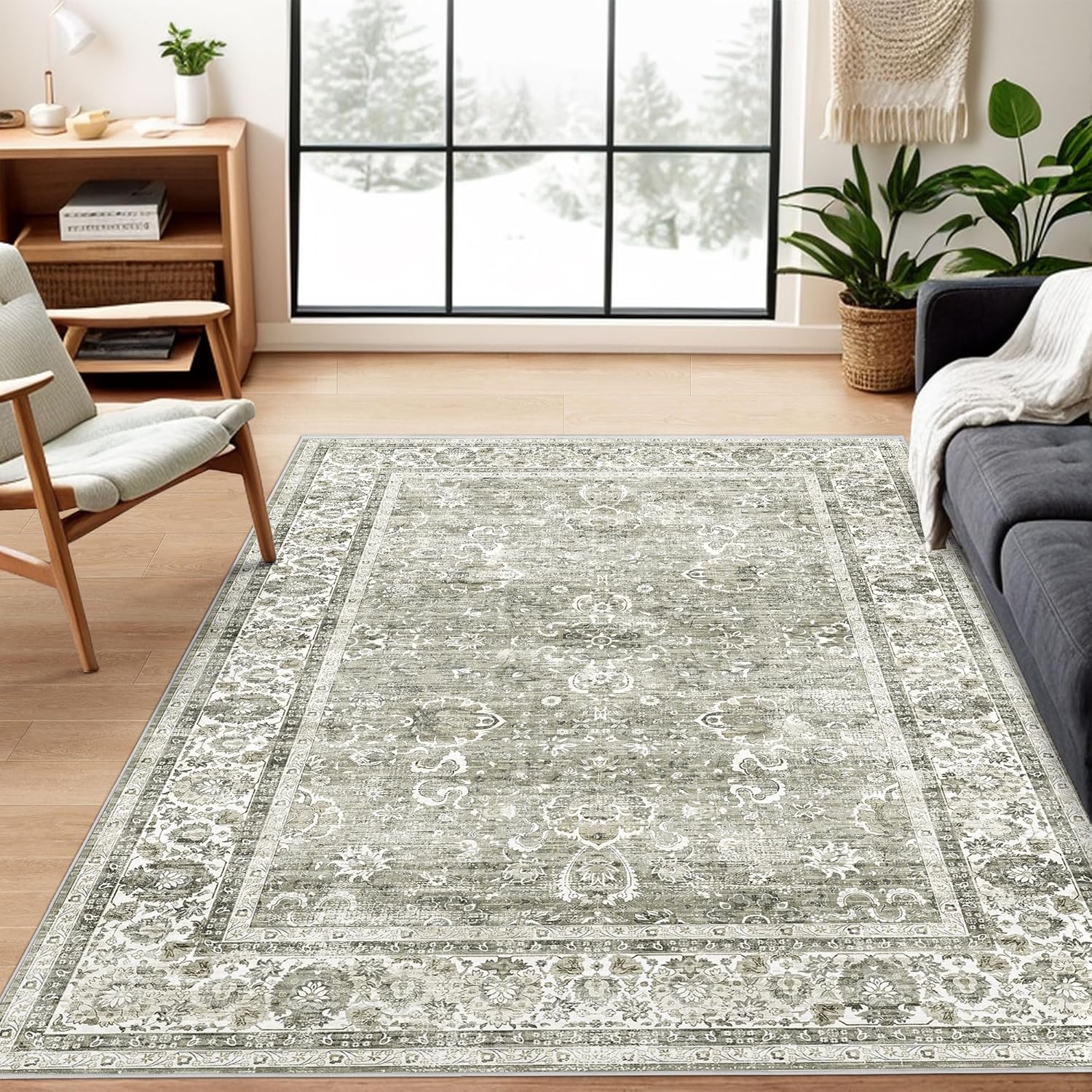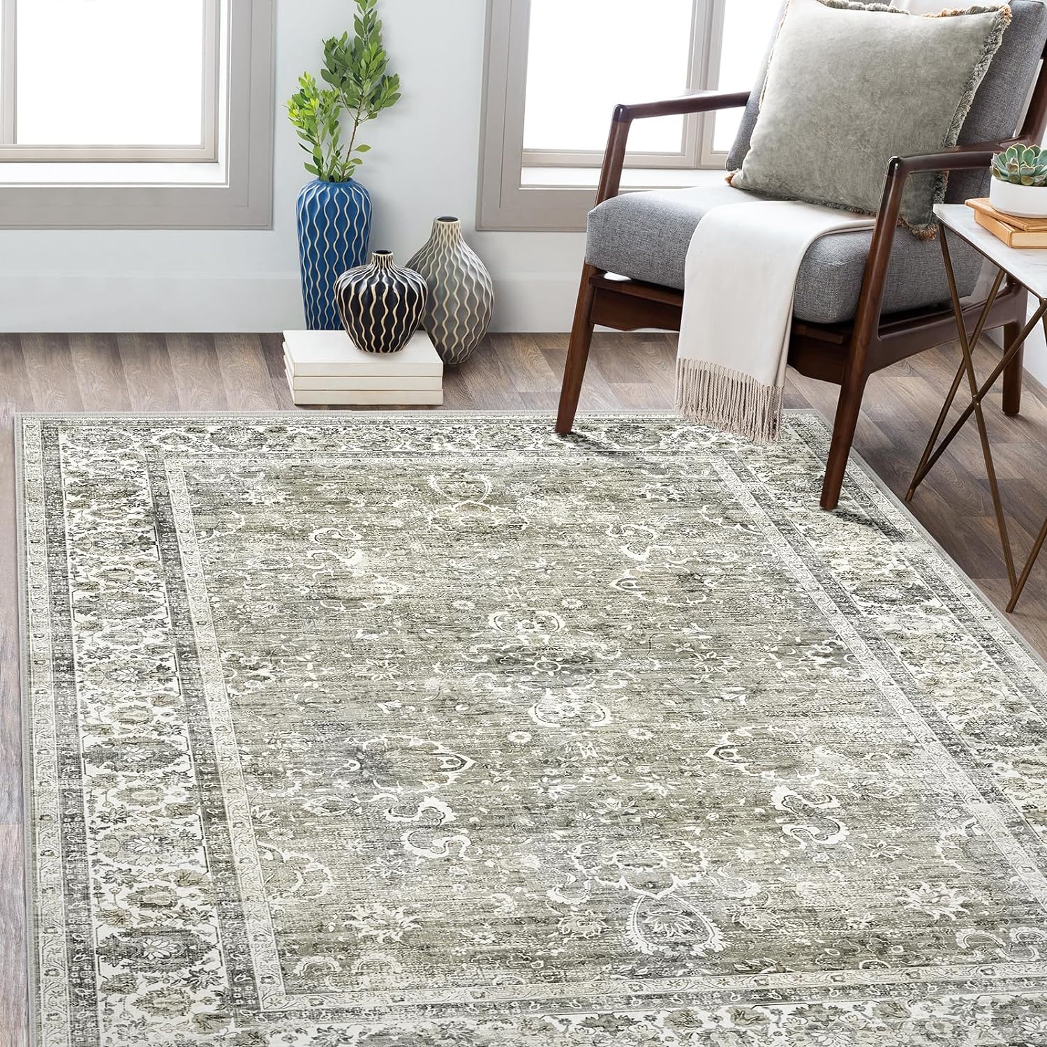 Deerly Washable Rug 5x7 Area Rugs for Living Room, Non Slip Large Rug for Bedroom Dining Room, Low-Pile Kid & Pet Friendly Distressed Carpet Print Floor(Cream)