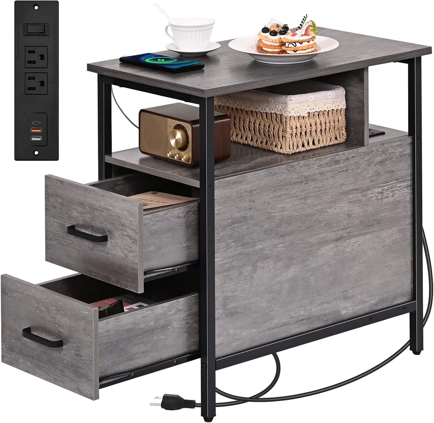 Side Table, Gray End Tables with Charging Station, Narrow End Table with Wooden Drawers, USB Ports and Power Outlets, Nightstand and Bedside Table, Side Table Living Room, Bedroom