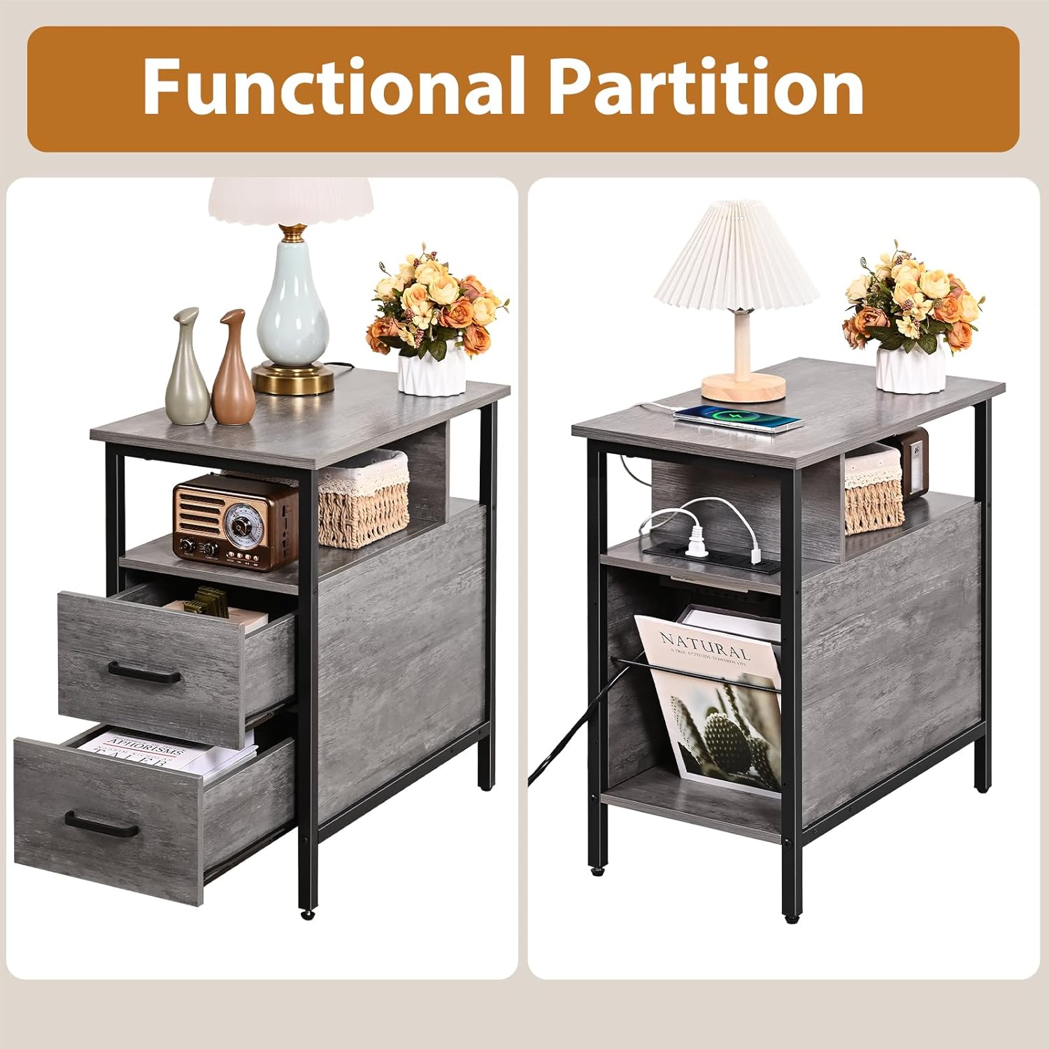 - Versatile End Tables: Our skinny end table is divided into three functional sections, open storage shelves, charging area and wood drawer storage. So this multifunctional end table also can be as nightstands, bedside table, office desk and printer stand.
